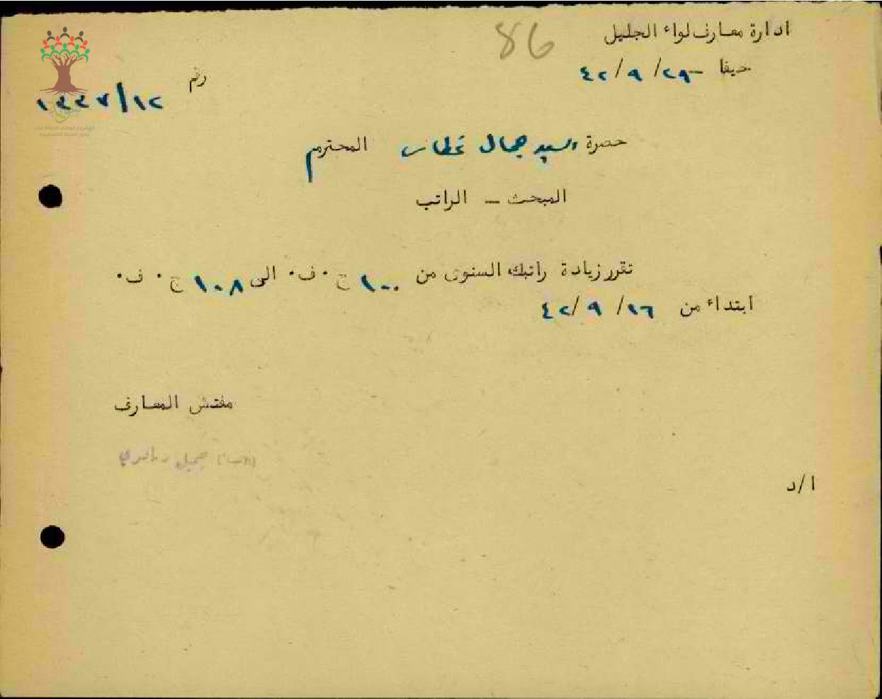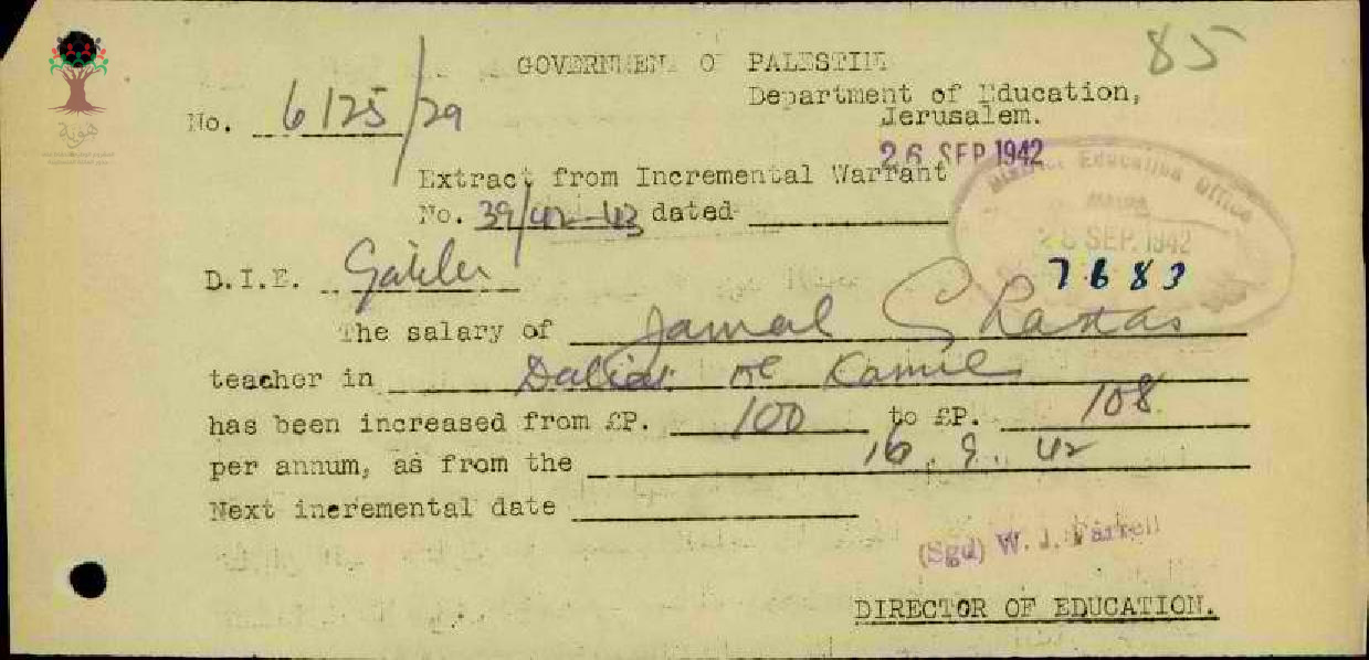 قرار زيادة راتب المعلم جمال غطاس ابتداءً من 1942/9/16