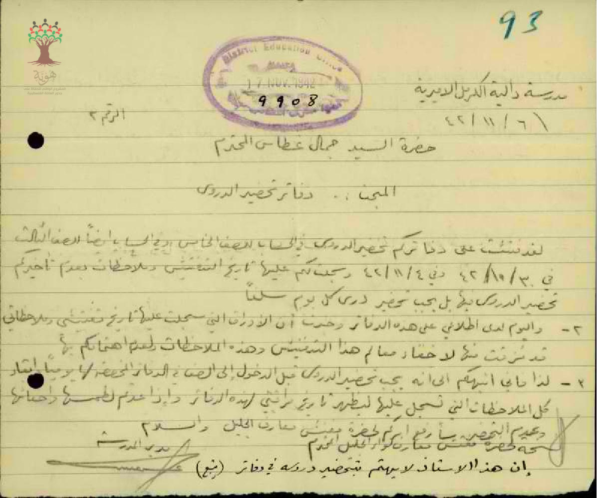 رسالة من مدير مدرسة دالية الكرمل إلى المعلم جمال غطاس بخصوص التفتيش بدفاتر تحضير الدروس