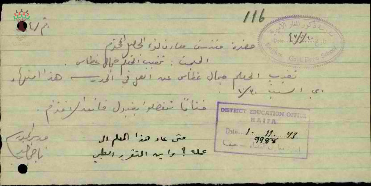 رسالة من مدير مدرسة المغار إلى مفتش المعارف يخبره بغياب المعلم جمال غطاس عن العمل في المدرسة يوم 10/30
