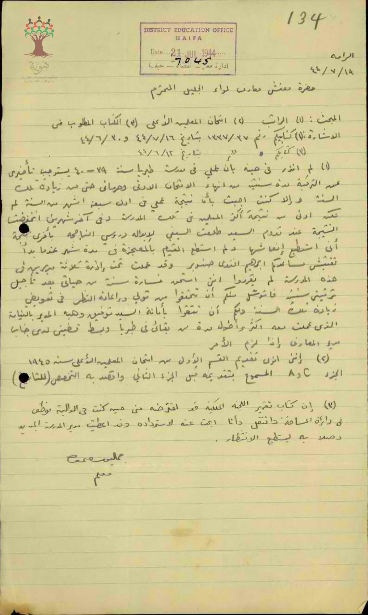 رسالة من المعلم جمال غطاس إلى مفتش المعارف يبحث معه أمر الراتب وامتحان المعلمين الأعلى