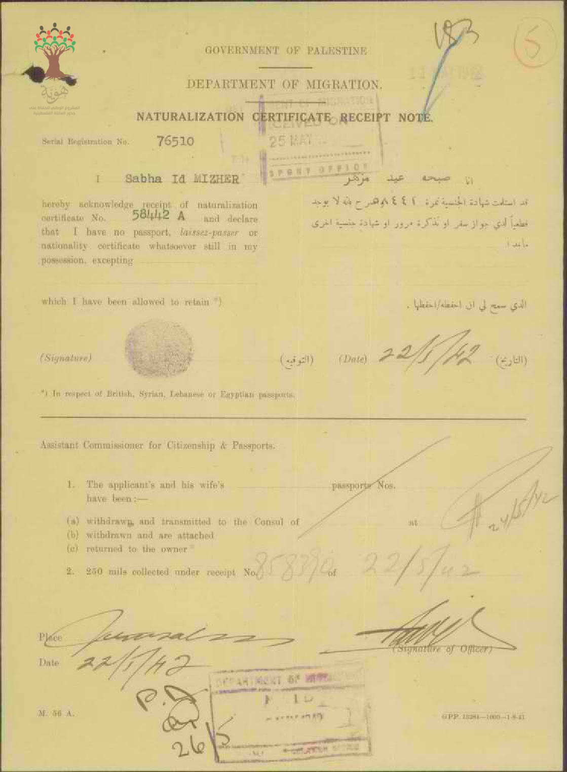إيصال موقع صبحة سابا مزهر صلاح باستلام شهادة الجنسية الفلسطينية