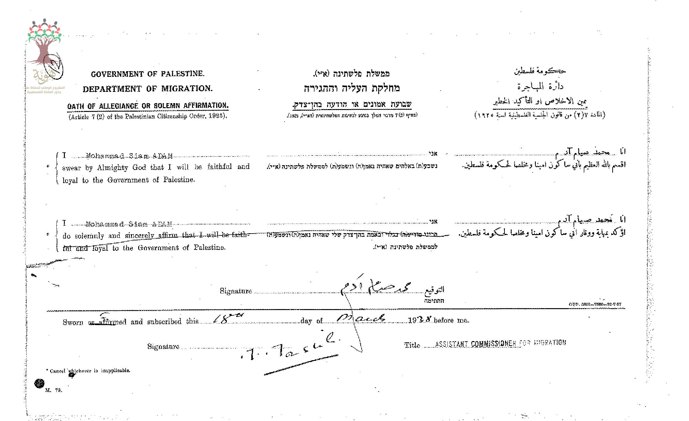 محمد صيام آدم يوقع على (يمين الإخلاص) للحصول على الجنسية الفلسطينية