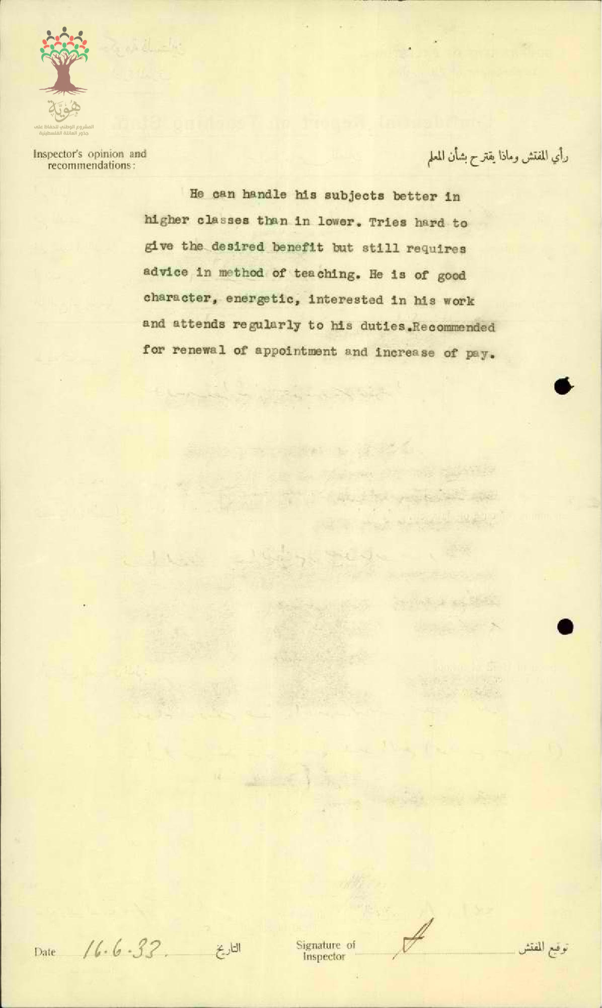 تقرير تفصيلي عن أداء المعلم أحمد موسى في مدرسة طبريا سنة 1933
