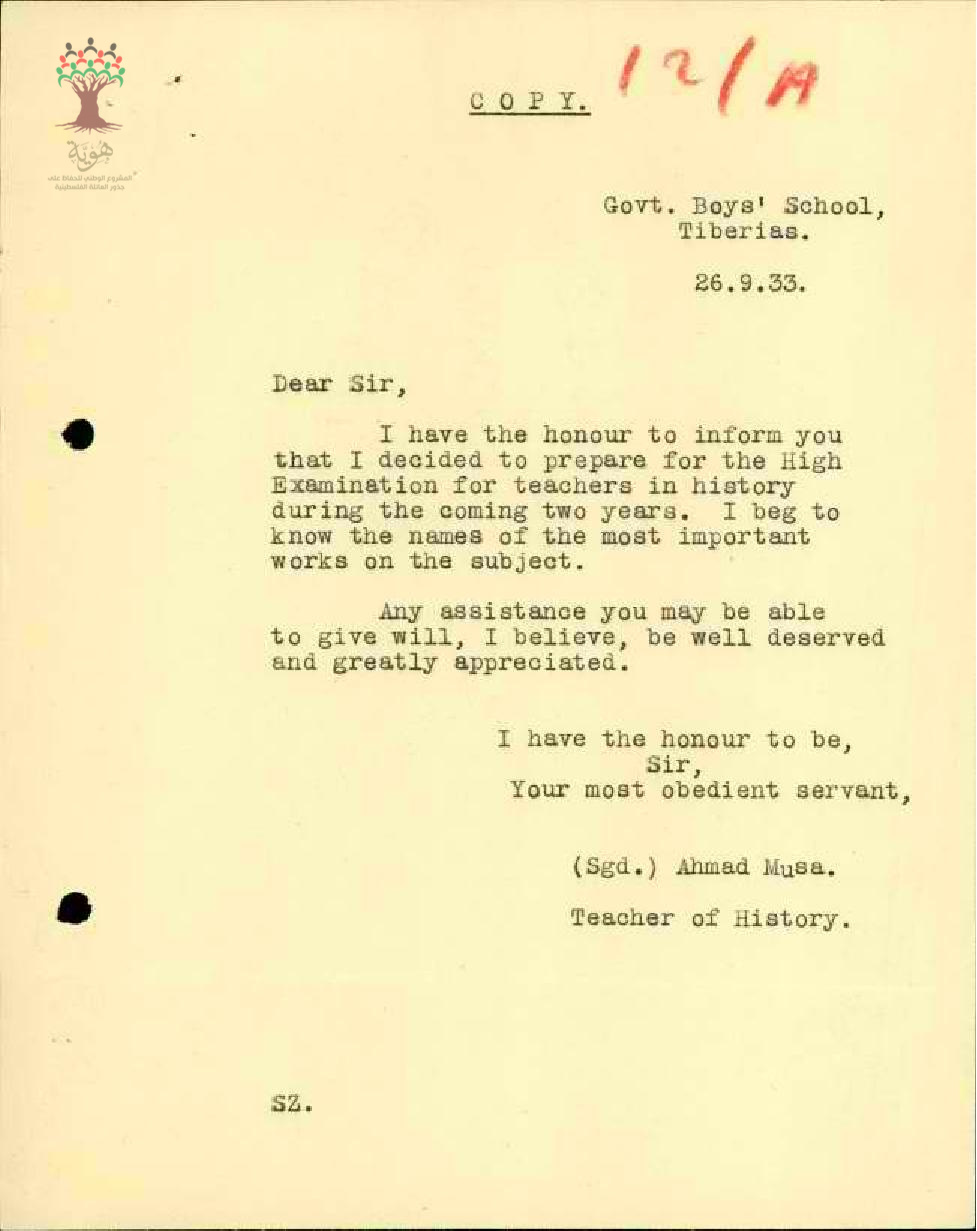 رسالة من المعلم أحمد موسى إلى مفتش المعارف يبحث معه أمر دخوله الامتحان الأعلى