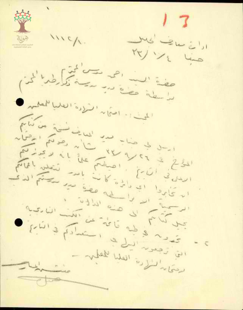 رسالة من مفتش المعارف إلى المعلم أحمد موسى بخصوص امتحان الشهادة العليا للمعلمين