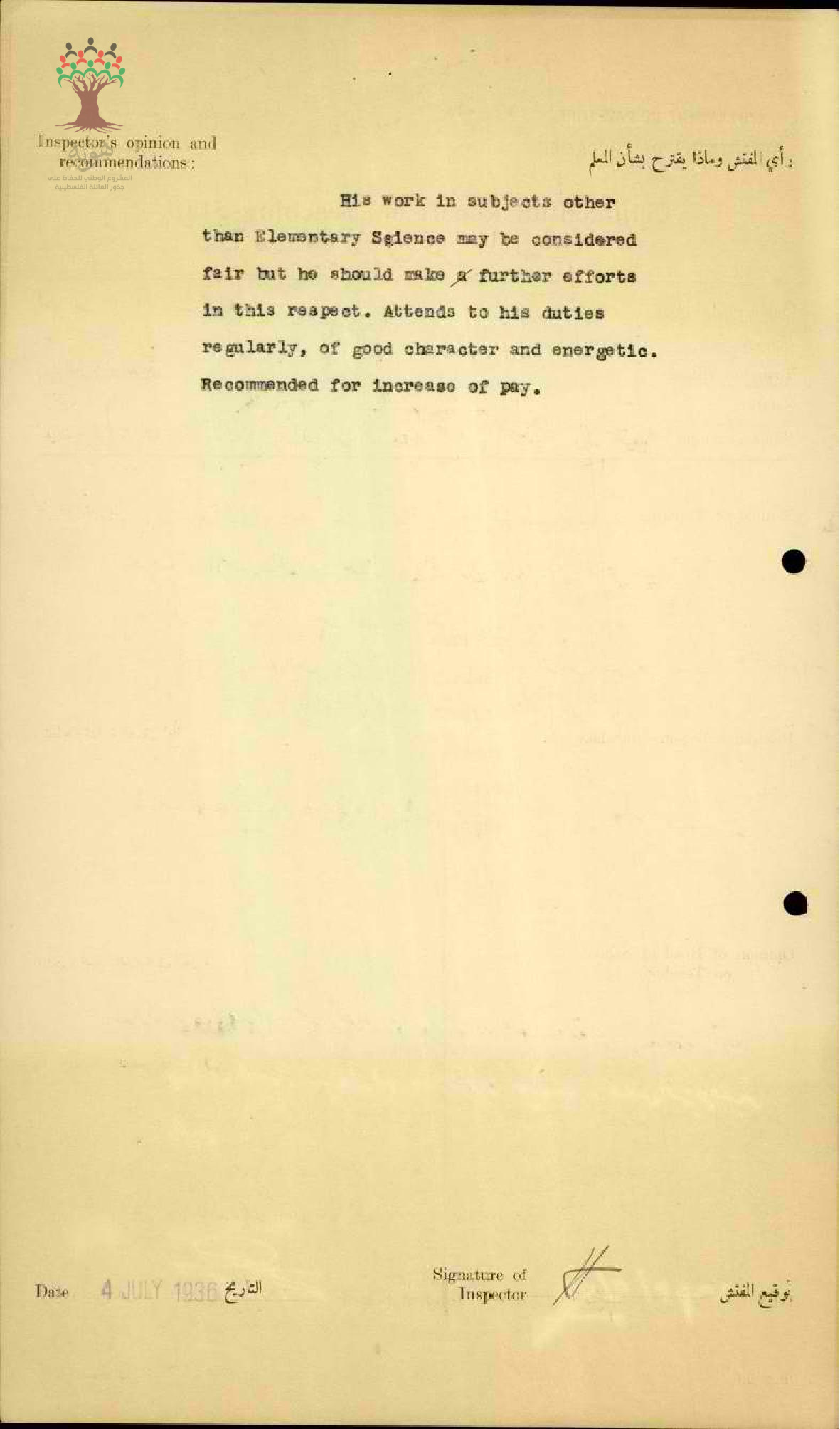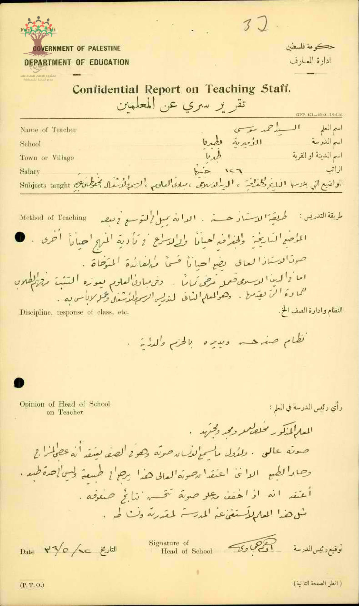 تقرير تفصيلي عن أداء المعلم أحمد موسى في مدرسة طبريا سنة 1936