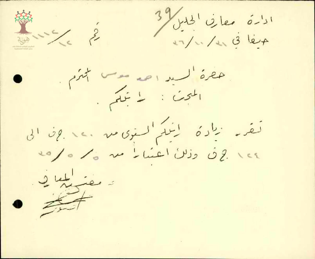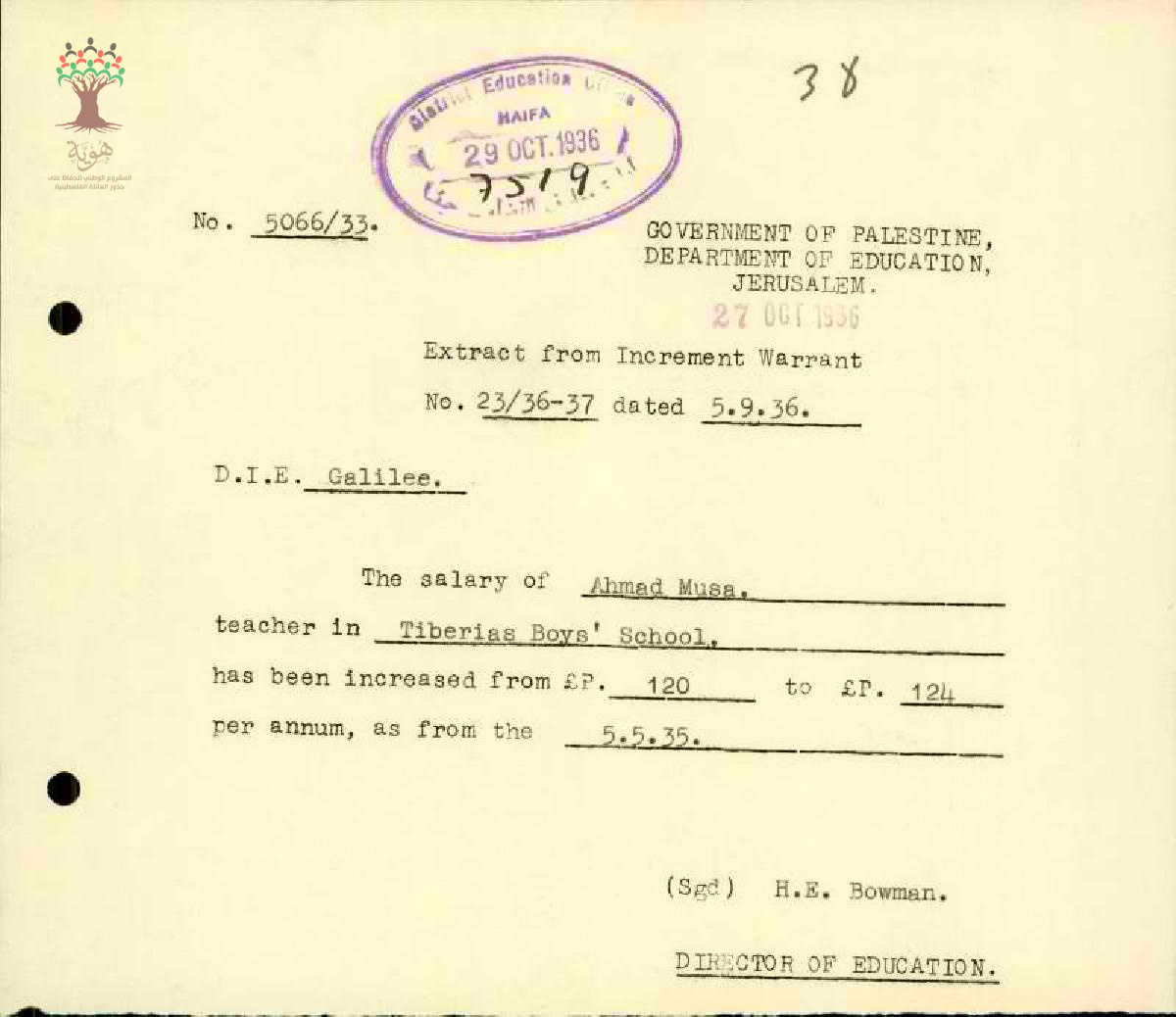 رسالة من مفتش المعارف إلى المعلم أحمد موسى يخبرهبقرار زيادة راتبه السنوي اعتباراً من تاريخ 5/5/1935