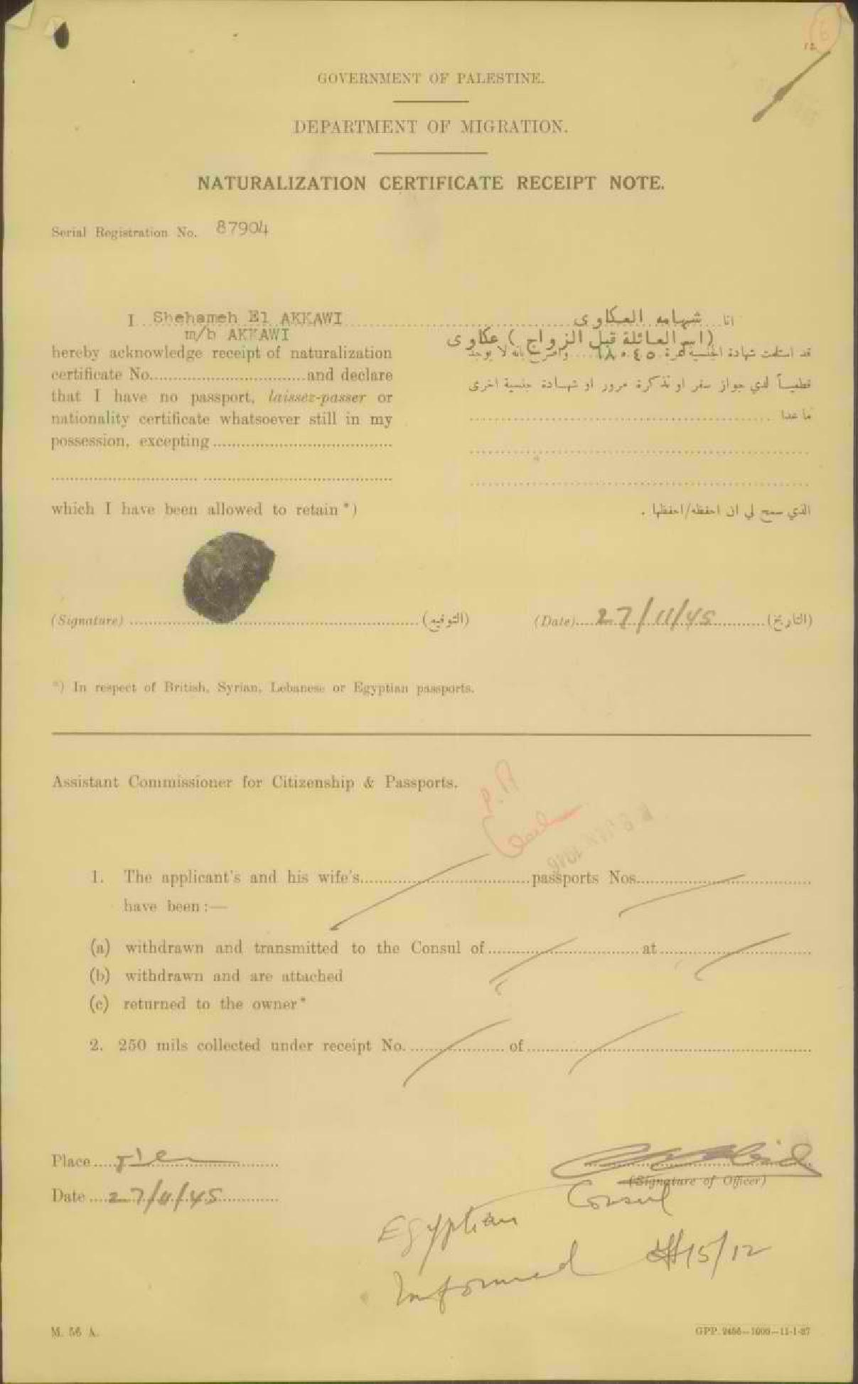إيصال موقع من شهامة عكاوي باستلام شهادة الجنسية الفلسطينية