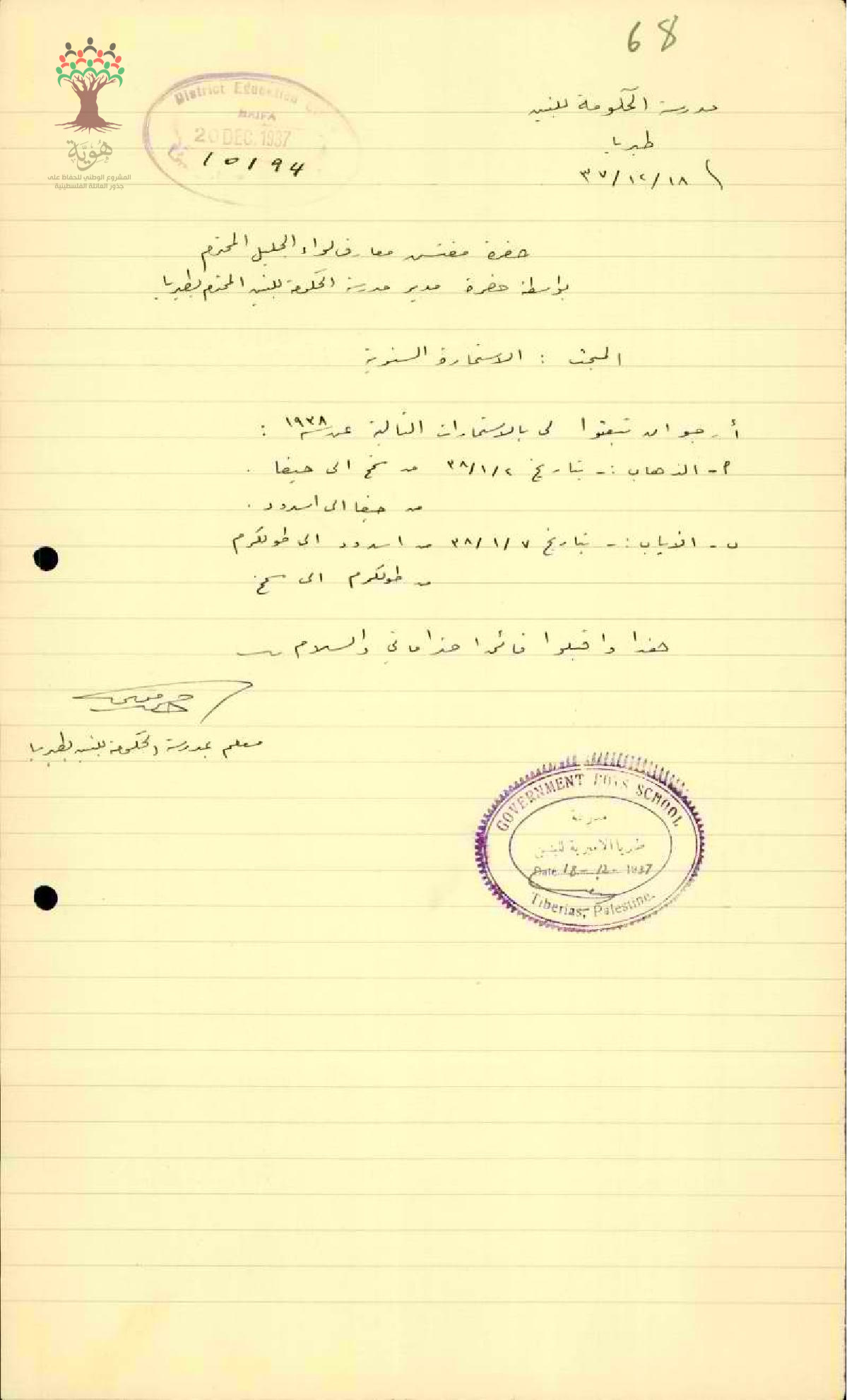 طلب للحصول على استمارة سفر مجاناً بالقطار في الإجازة للمعلم أحمد موسى سنة 1937