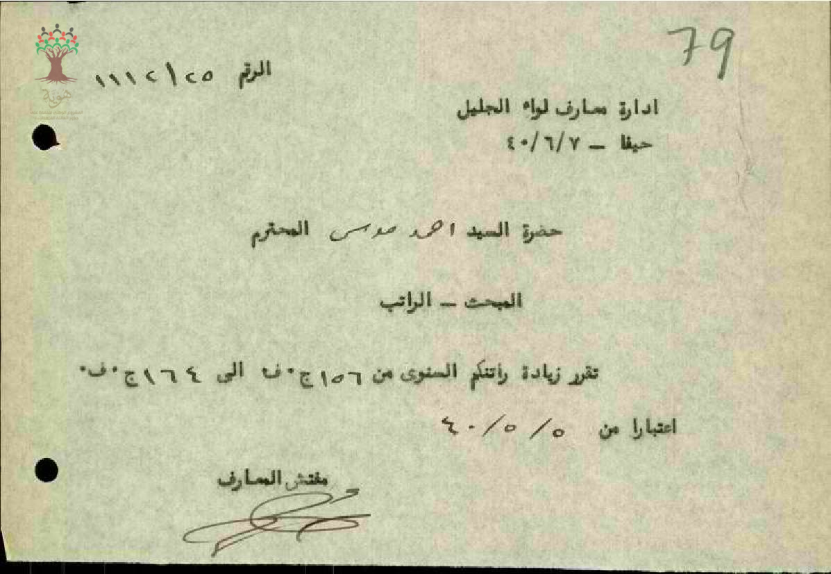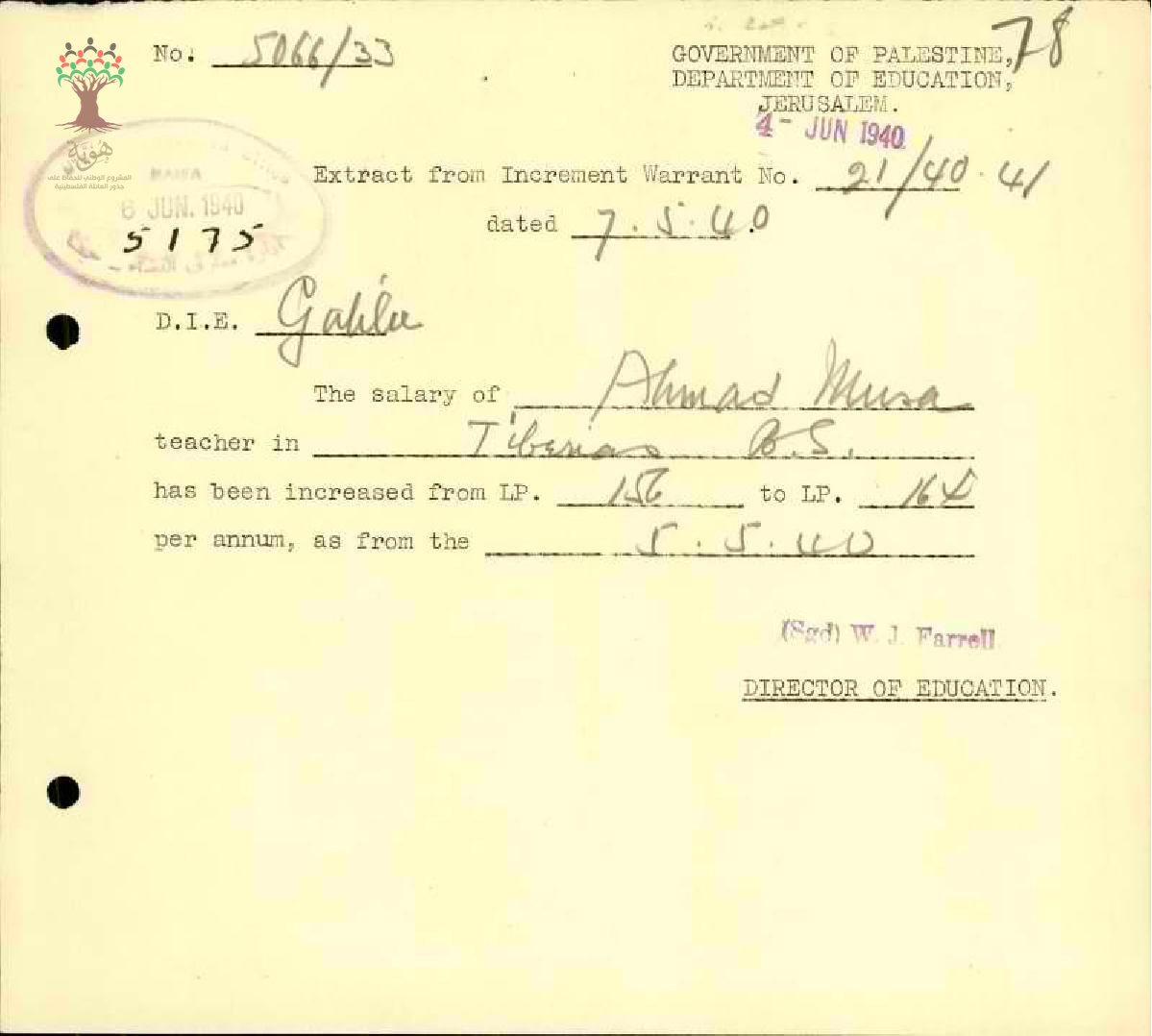 رسالة من مفتش المعارف إلى المعلم أحمد موسى يخبره بقرار زيادة راتبه السنوي اعتباراً من تاريخ 5/5/1940