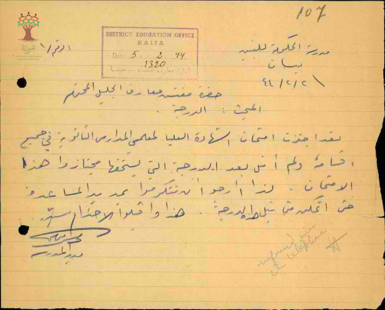 رسالة من المعلم أحمد موسى إلى مفتش المعارف يبحث معه الدرجة التي يستحقها مجتازو امتحان الشهادة العليا لمعلمي المدارس الثانوية
