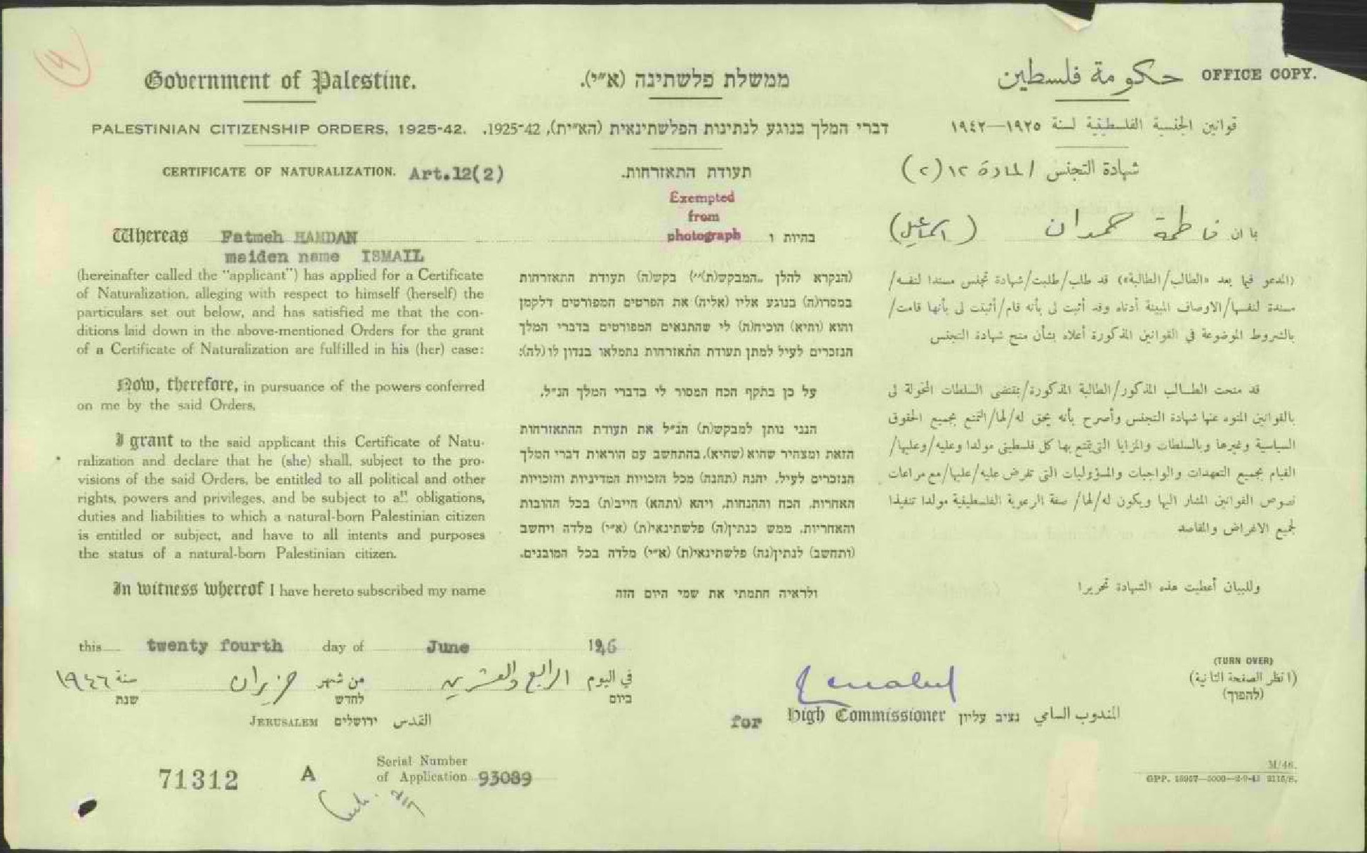 شهادة الجنسية الفلسطينية ل فاطمة حمدان
