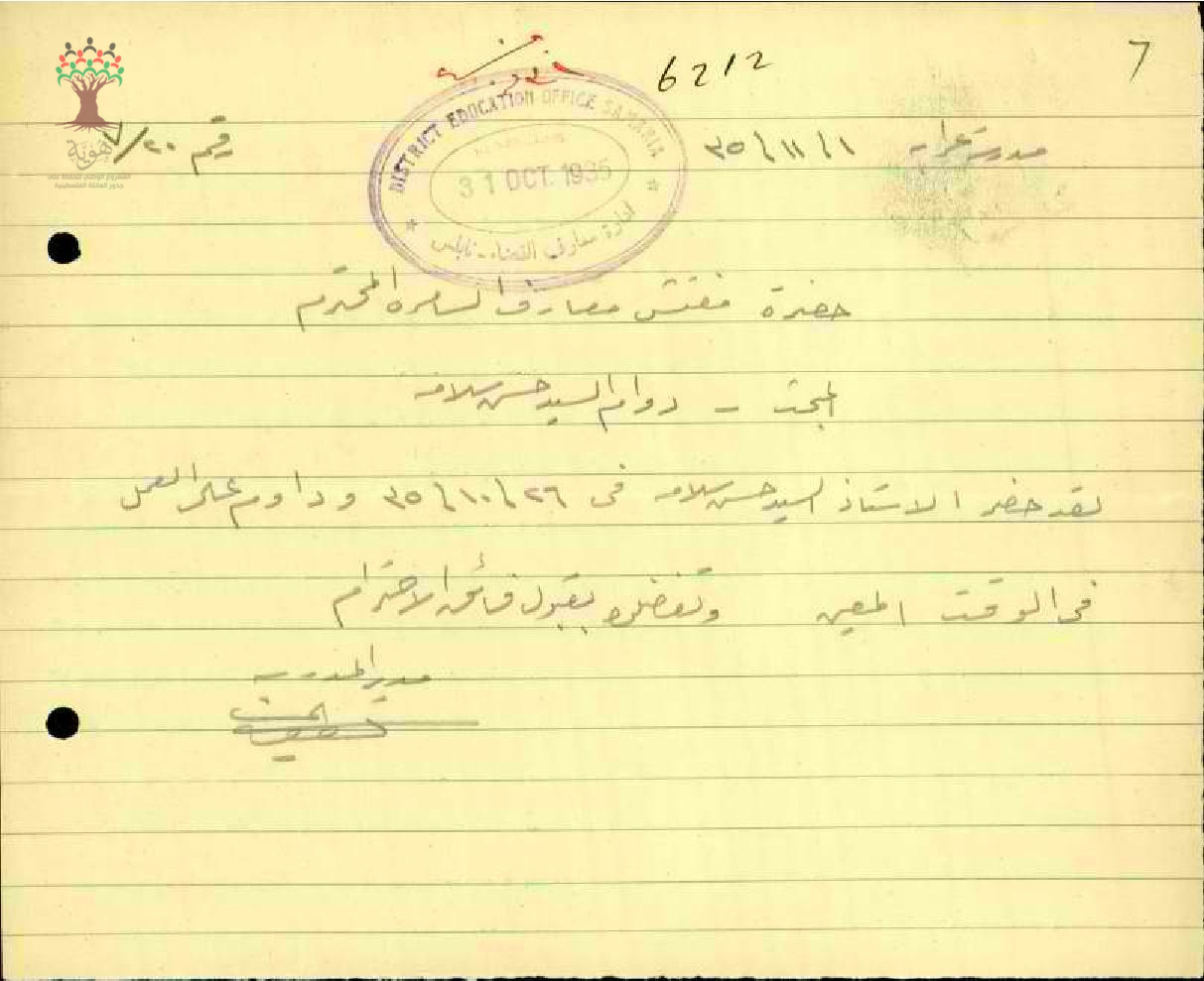 رسالة من مدير مدرسة عرابة إلى مفتش المعارف يخبره بحضور المعلم حسن سلامة ومباشرة العمل في المدرسة