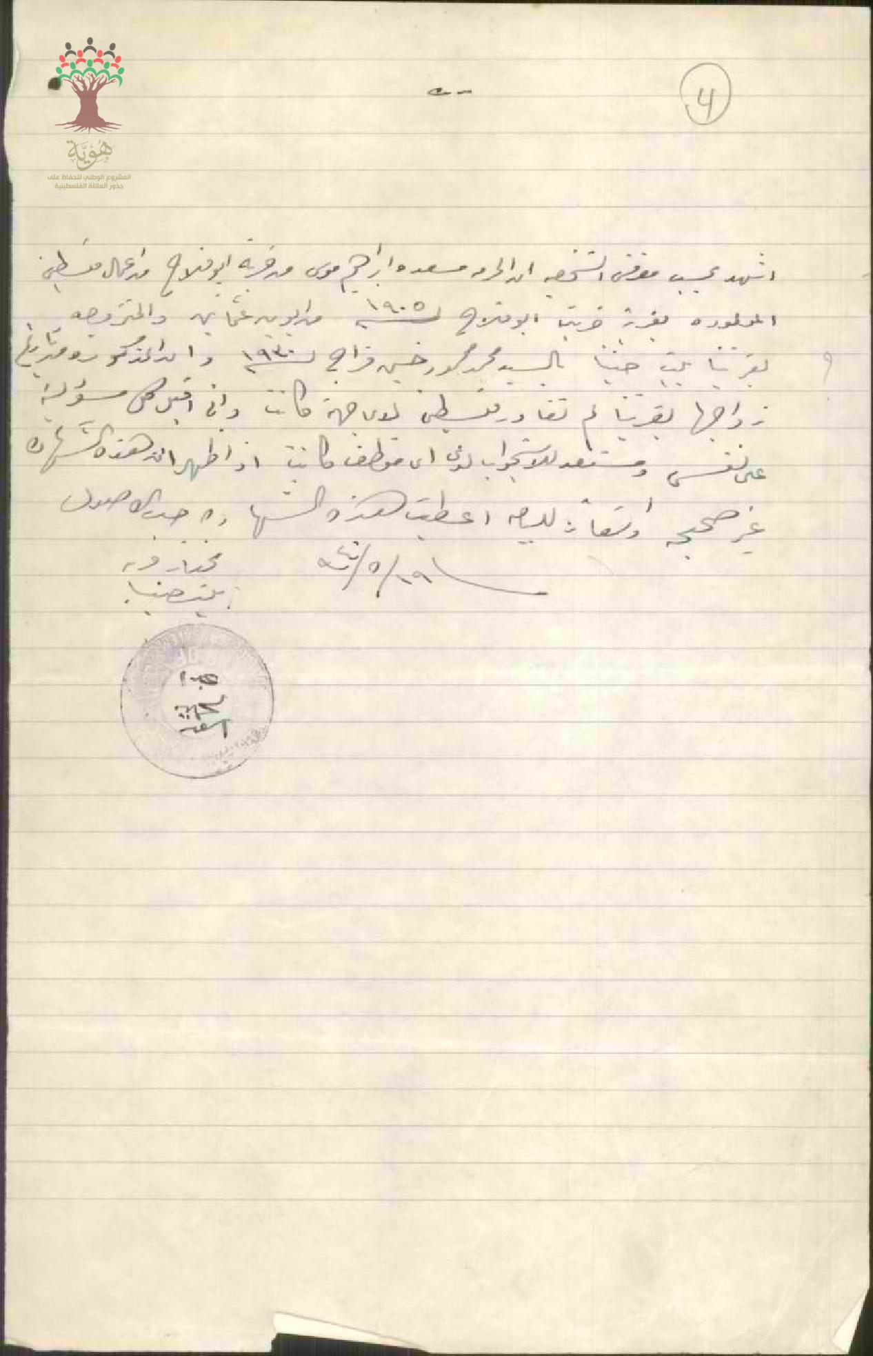شهادة من المختار عبد الحميد أسعد للسيدة مسعدة موسى زوجة محمد فراج بخصوص طلب الجنسية/بيت حنينا