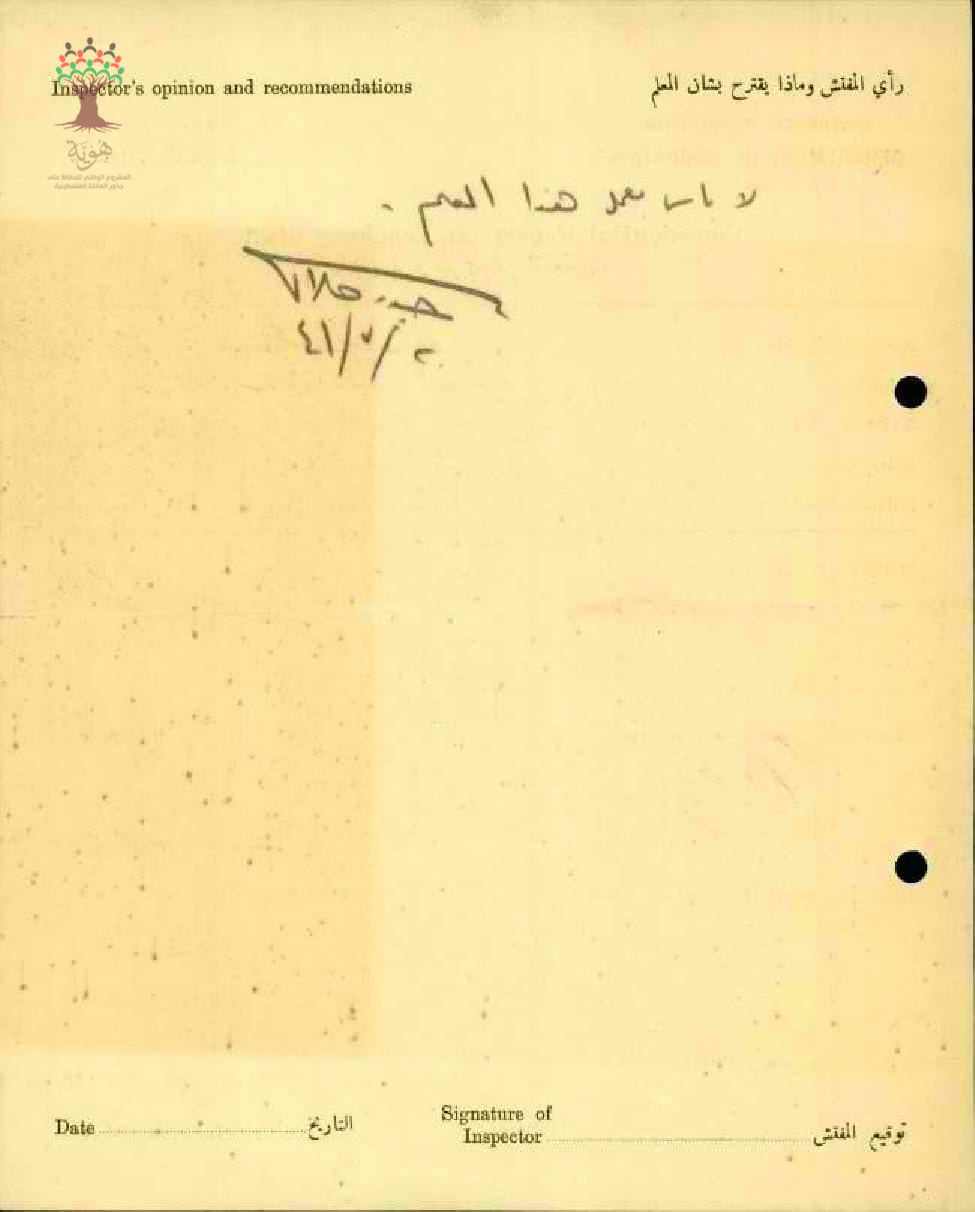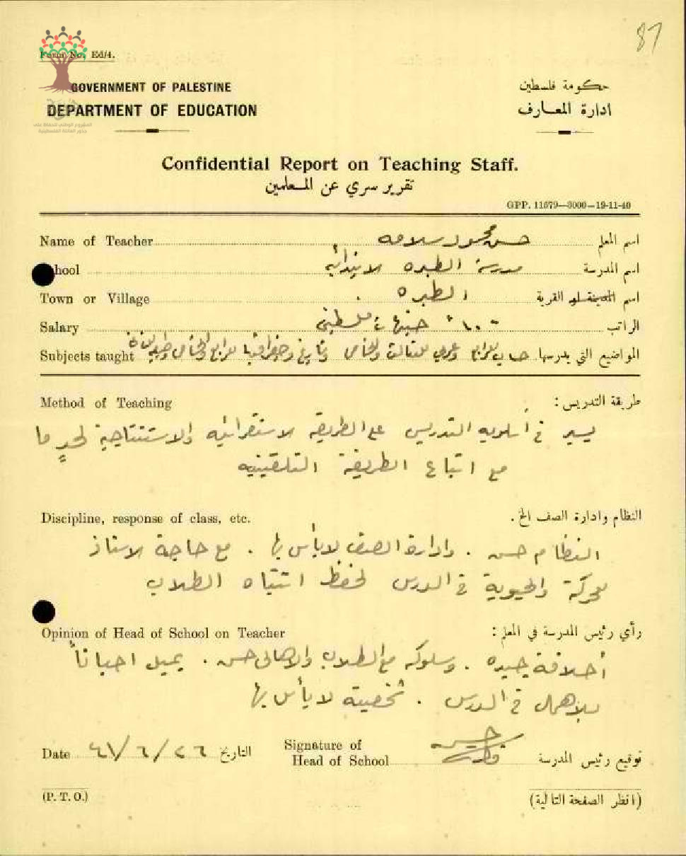 تقرير تفصيلي عن أداء المعلم حسن سلامة في مدرسة الطيرة سنة 1941