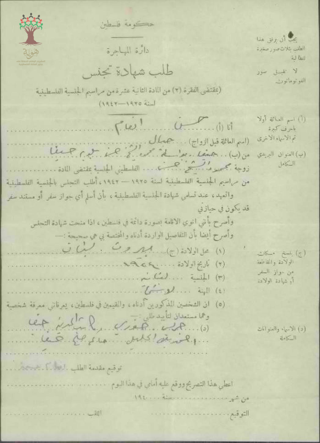 طلب الجنسية الفلسطينية-إنعام الشيخ حسن حبال-حيفا/لبنان