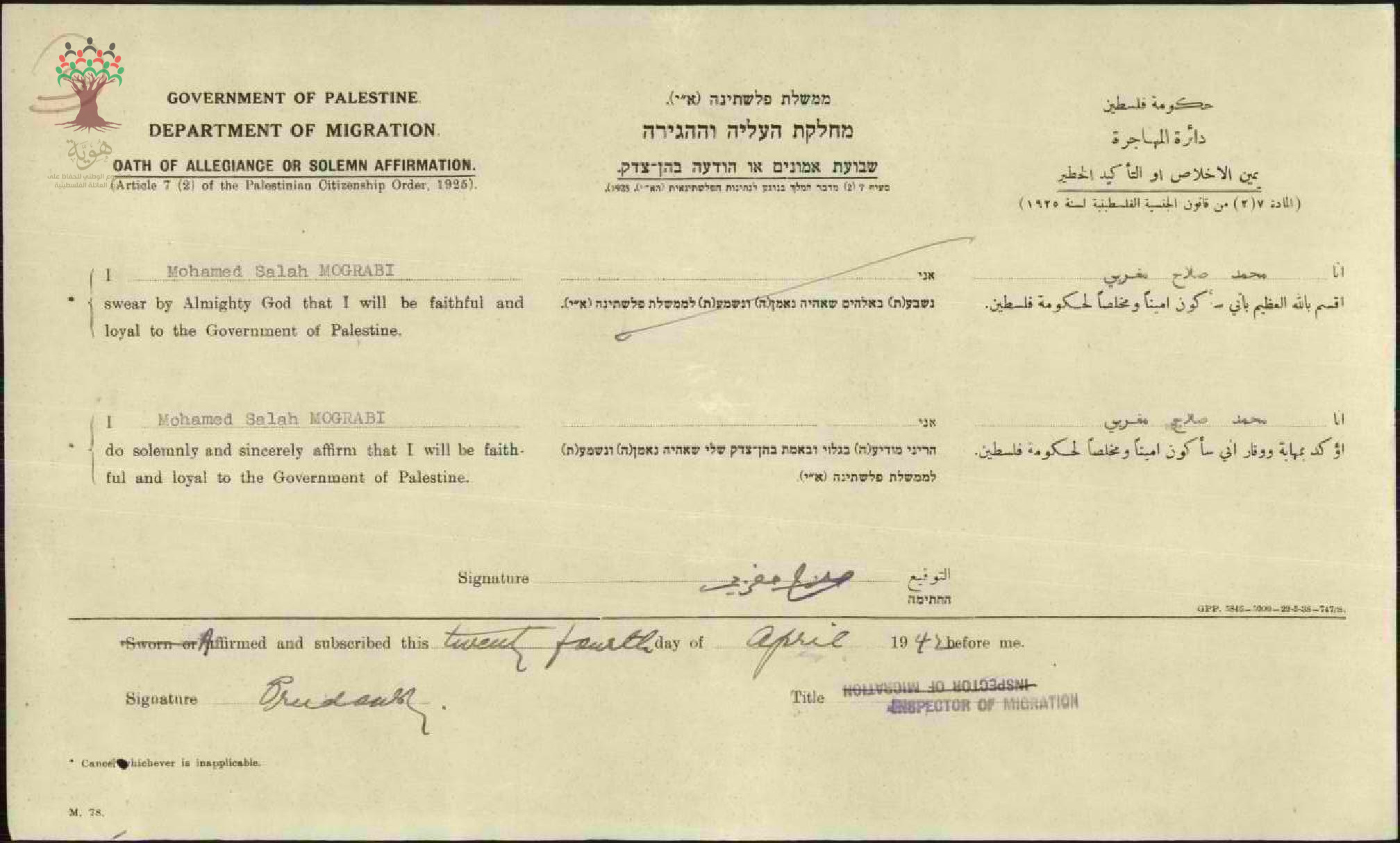 محمد صلاح المغربي يوقع على (يمين الإخلاص) للحصول على الجنسية الفلسطينية