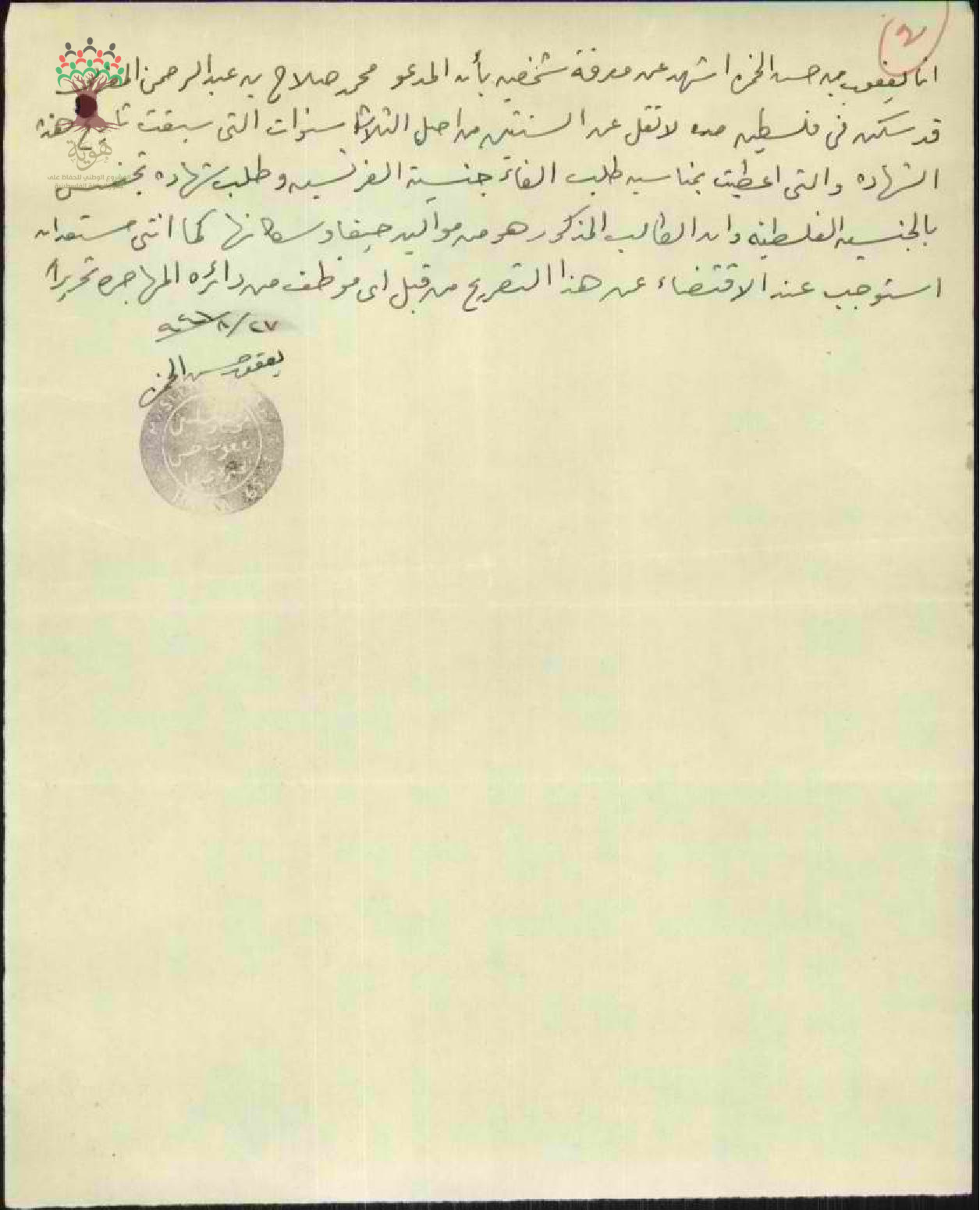 شهادة من المختار يعقوب حسن الخمرة للسيد محمد صلاح المغربي بخصوص طلب الجنسية/حيفا