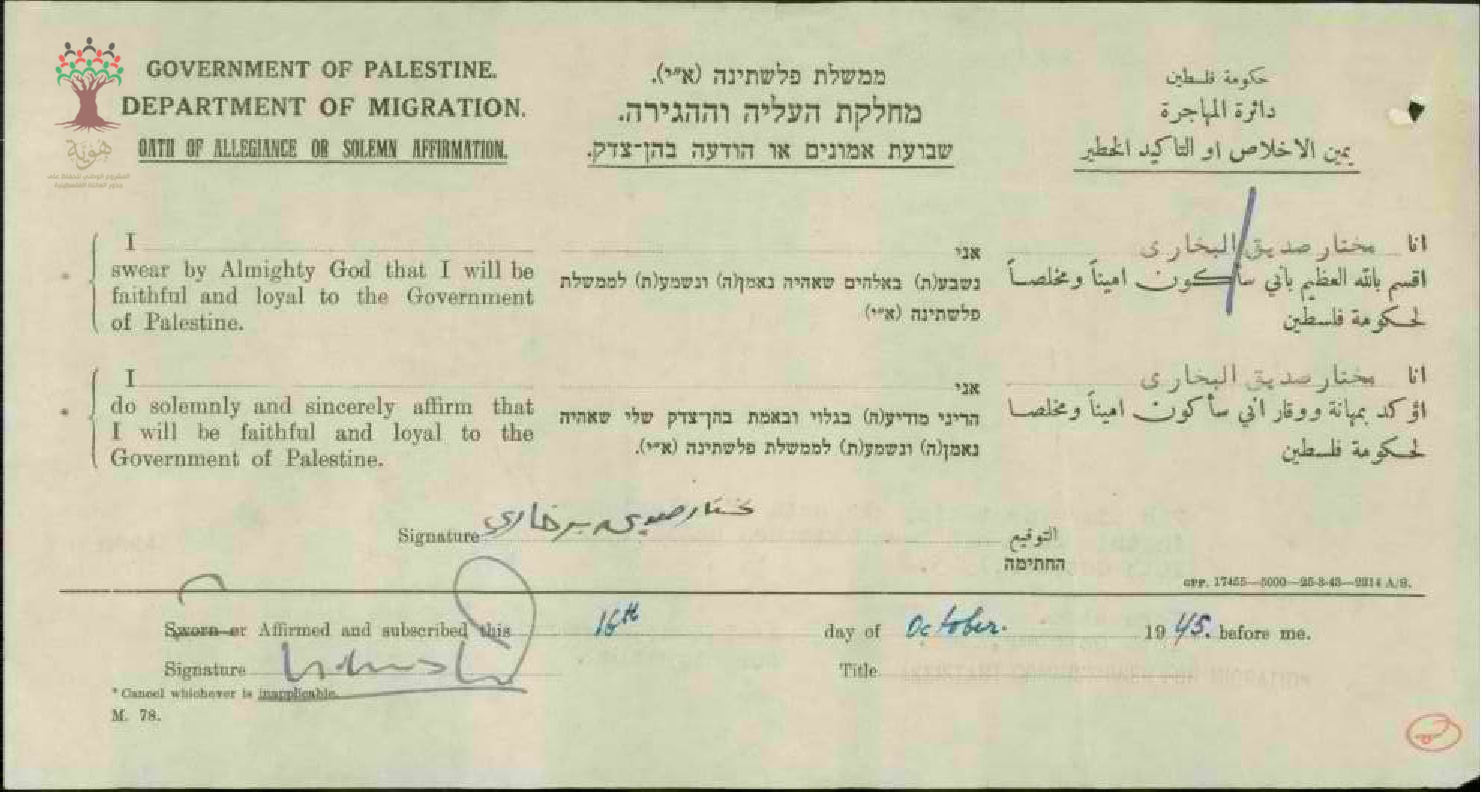 مختار البخاري يوقع على (يمين الإخلاص) للحصول على الجنسية الفلسطينية
