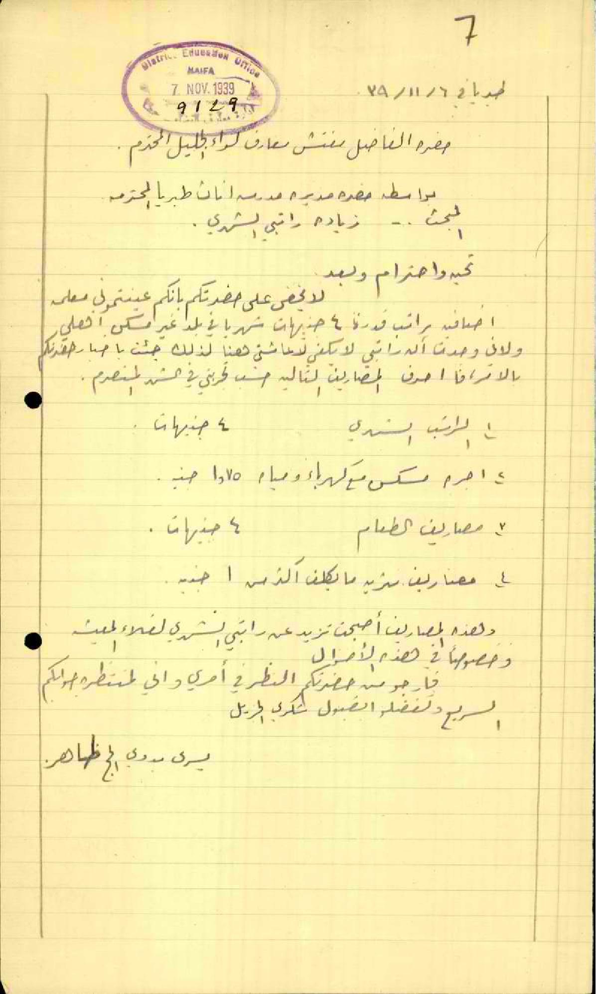 طلب زيادة رتب مقدم من المعلمة يسرى ظاهر من مدرسة طبريا إلى مفتش المعارف