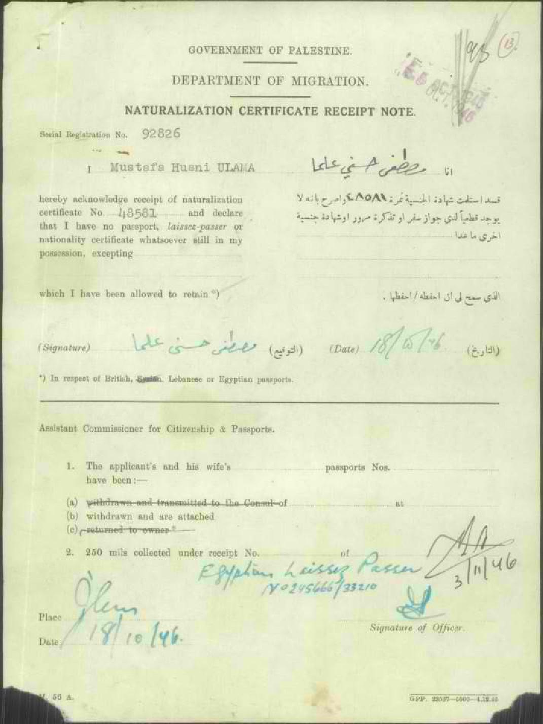 إيصال موقع من مصطفى علما باستلام شهادة الجنسية الفلسطينية