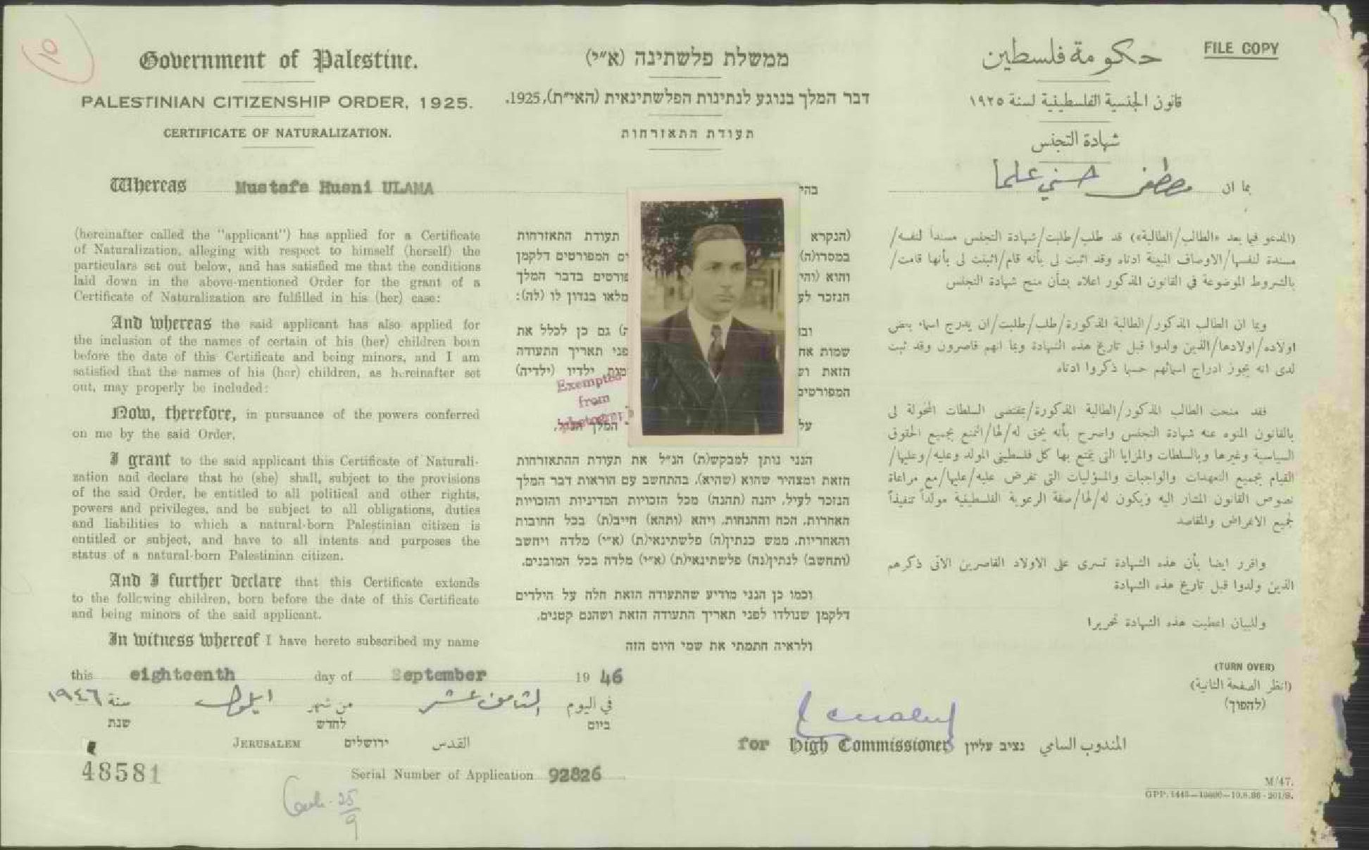 شهادة الجنسية الفلسطينية ل مصطفى علما