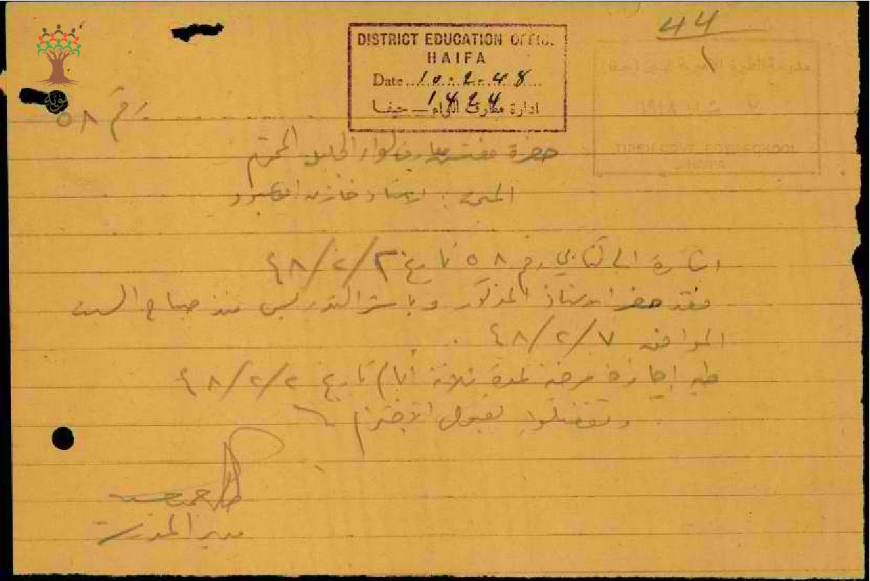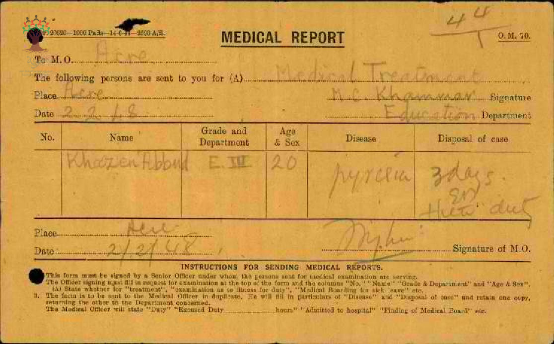 رسالة من مدير مدرسة الطيرة إلى مفتش المعارف يخبره بعودة المعلم خازن عبود إلى العمل مرفقاً التقرير الطبي