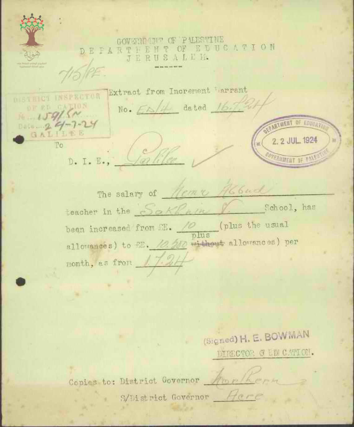 زيادة راتب المعلم نمر عبود سنة 1924