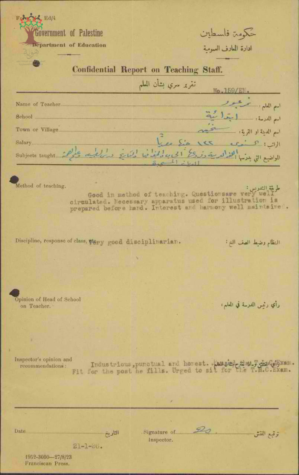 تقرير تفصيلي عن أداء المعلم نمر عبود في مدرسة سخنين سنة 1926