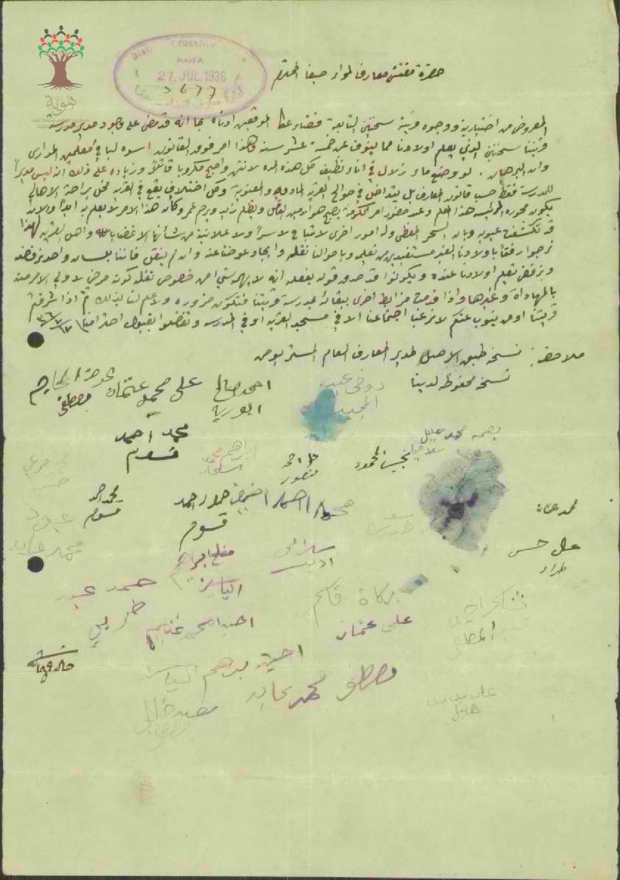 رسالة موقعة من مخاتير ووجوه قرية سخنين إلى مفتش المعارف يطلبون منه تبديل المعلم نمر عبود وايجاد عوضاً عنه