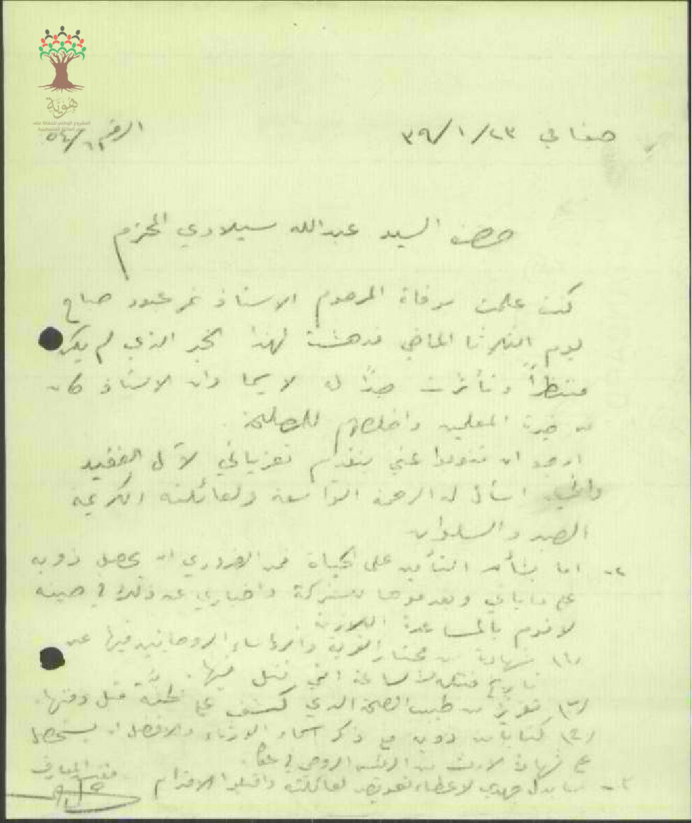 رسالة من مفتش المعارف إلى السيد عبد الله سيلاوي يطلب منه أن ينوب عنه في تقديم التعازي لأهل الفقيد المعلم نمر عبود