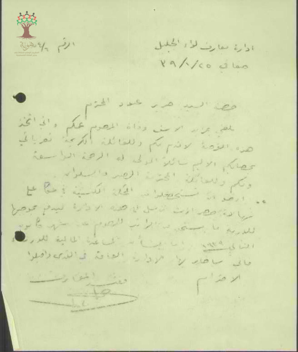 رسالة من مفتش المعارف إلى المعلم جبر عبود بخصوص تعويض المعلم نمر عبود وحصر الإرث