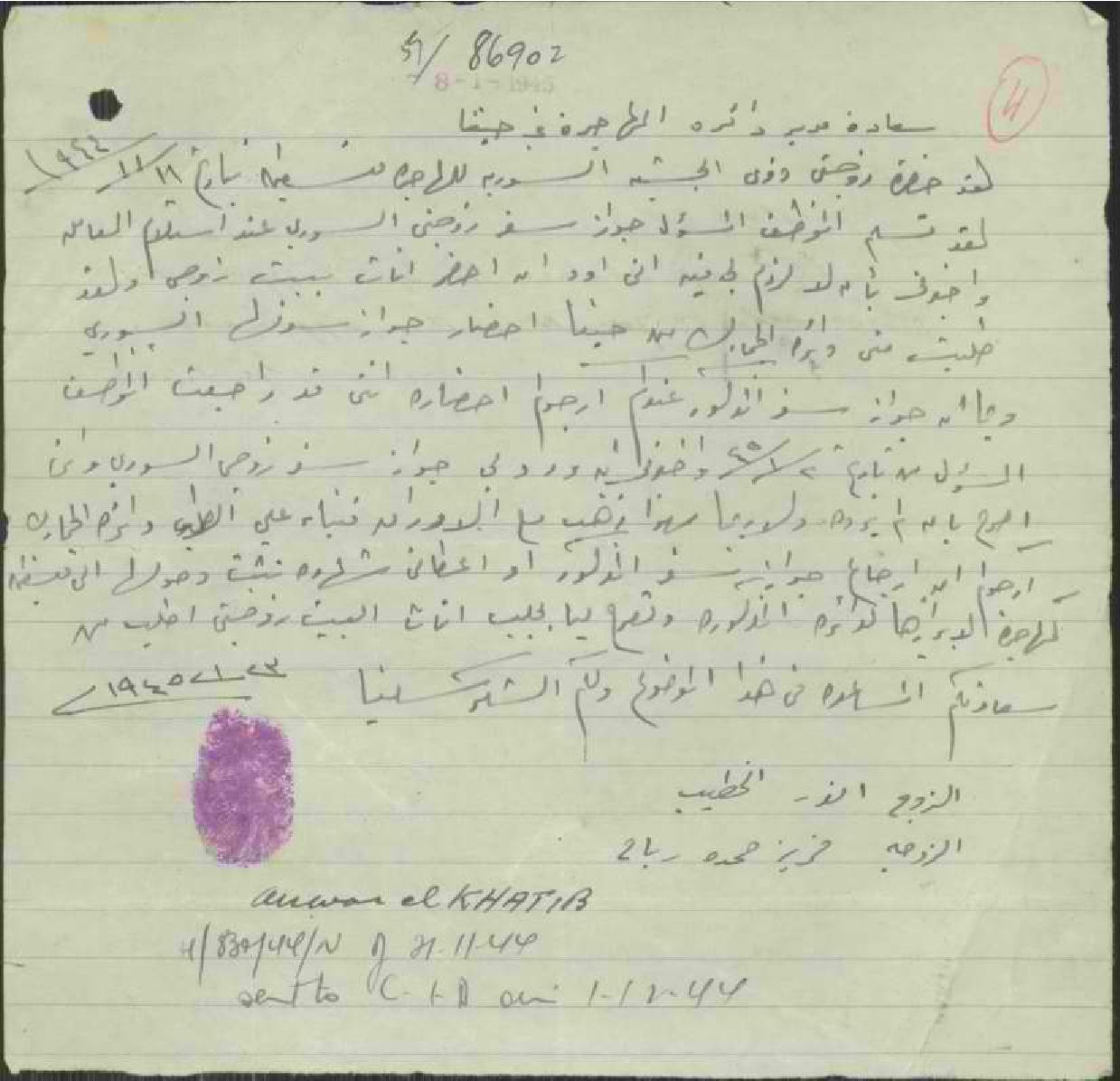 رسالة من زوج فريزة رباح الخطيب الى مدير المهاجرة بخصوص طلب الجنسية الفلسطينية