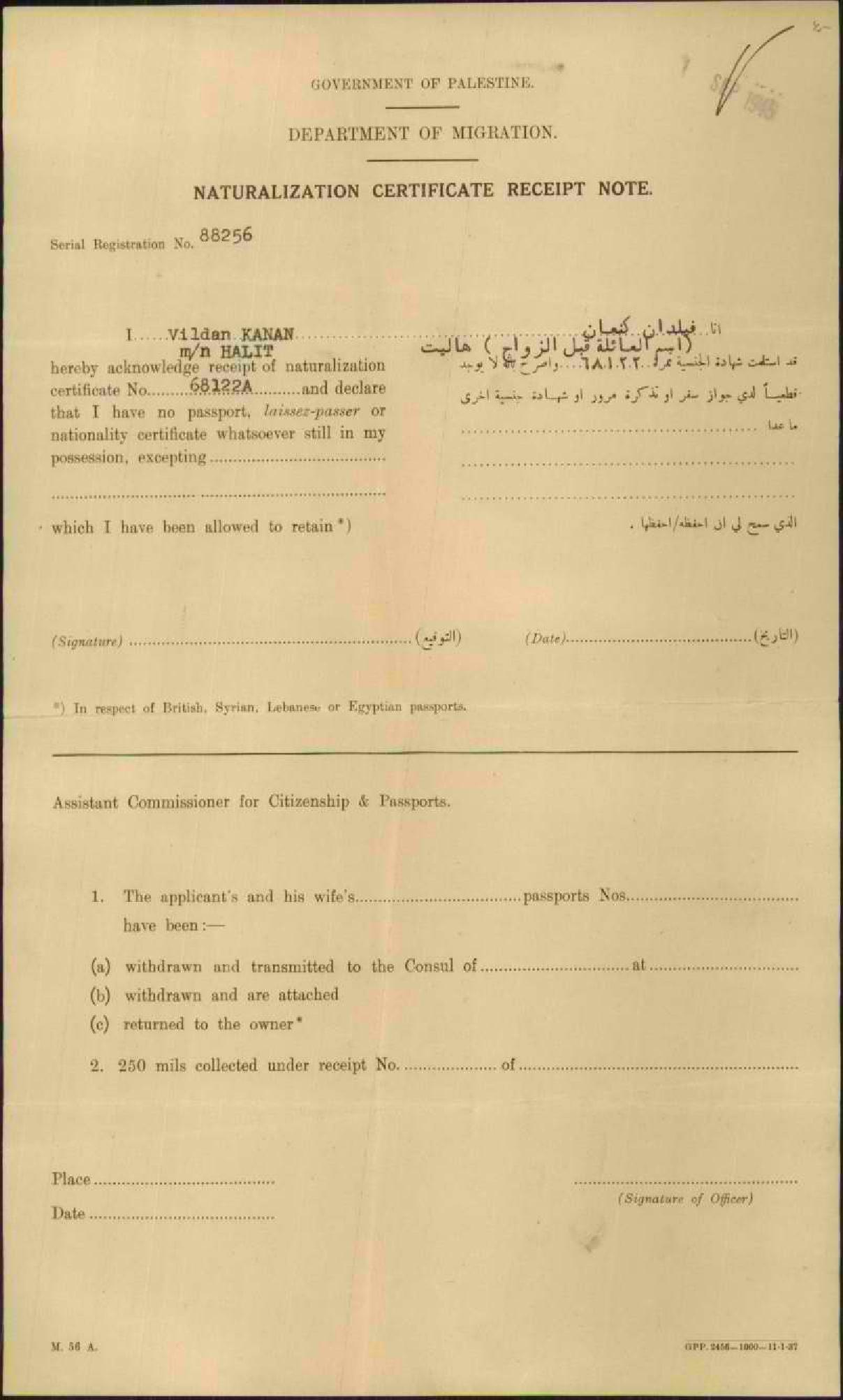 إيصال موقع من فيلدان كنعان باستلام شهادة الجنسية الفلسطينية