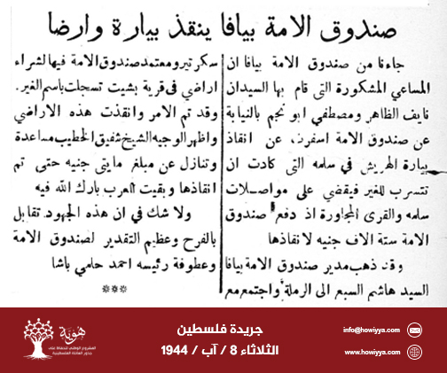صندوق الأمة بيافا ينقذ بيارة وأرضاَ 8/8/1944
