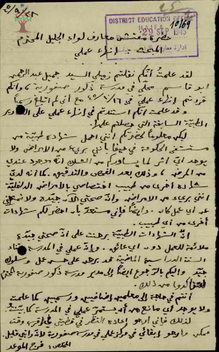 رسالة من المعلم فرج موعد إلى مفتش المعارف يبحث معه أمر إنهاء عمله في مدرسة صفورية