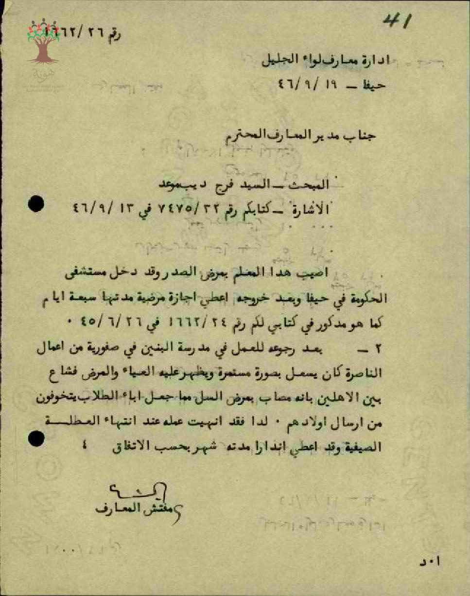 رسالة من مفتش المعارف إلى مدير المعارف يبحث معه مرض المعلم فرج موعد ودخوله المستشفى الحكومي