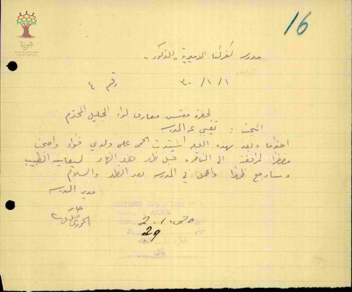 رسالة من المعلم جابر خوري إلى مفتش المعارف يبحث معه أمر تغيبه عن المدرسة بسبب مرض ابنه