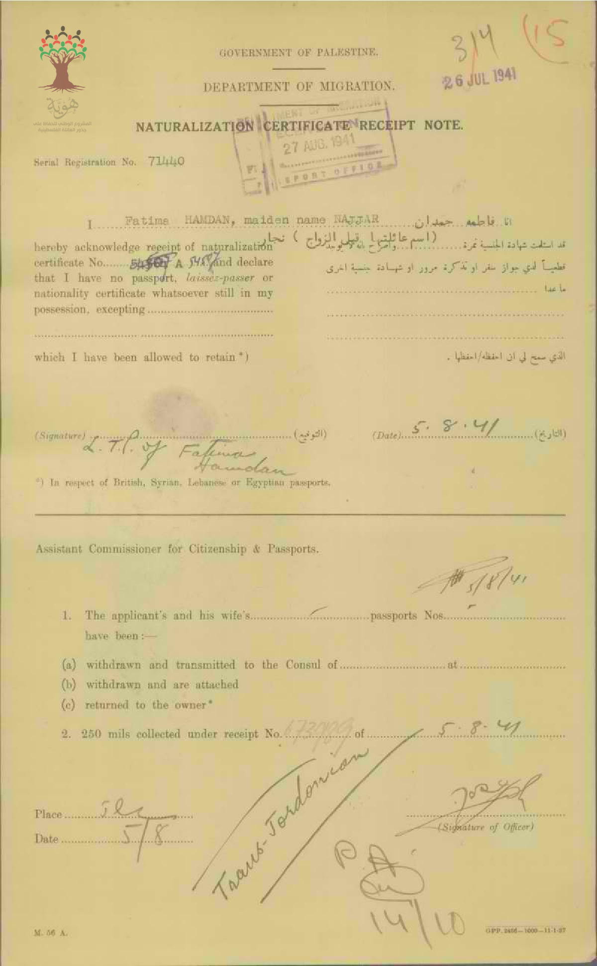 إيصال موقع من فاطمة نجار حمدان باستلام شهادة الجنسية الفلسطينية