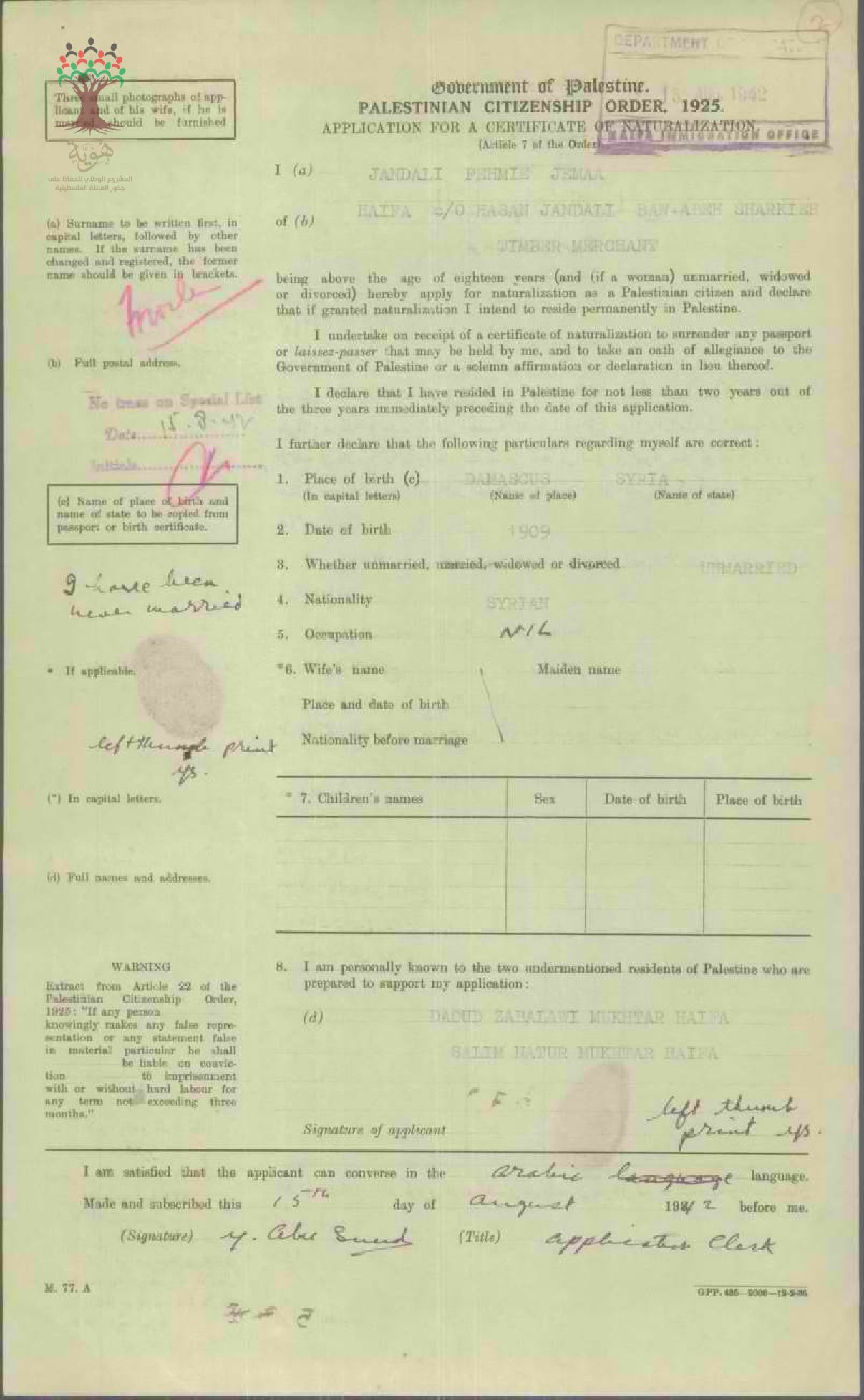 طلب الجنسية الفلسطينية-فهيمة جمعة جندلي-حيفا/سوريا