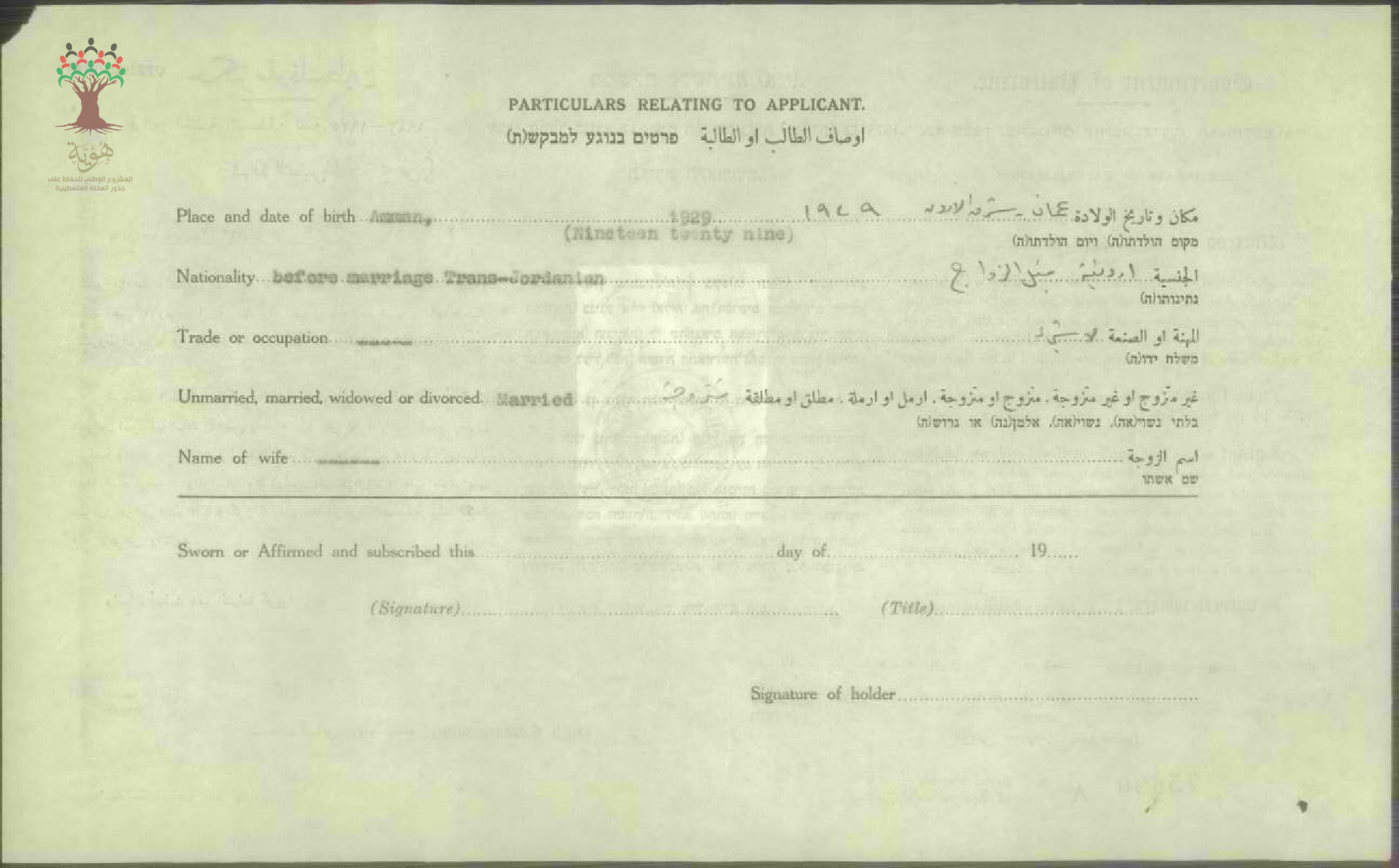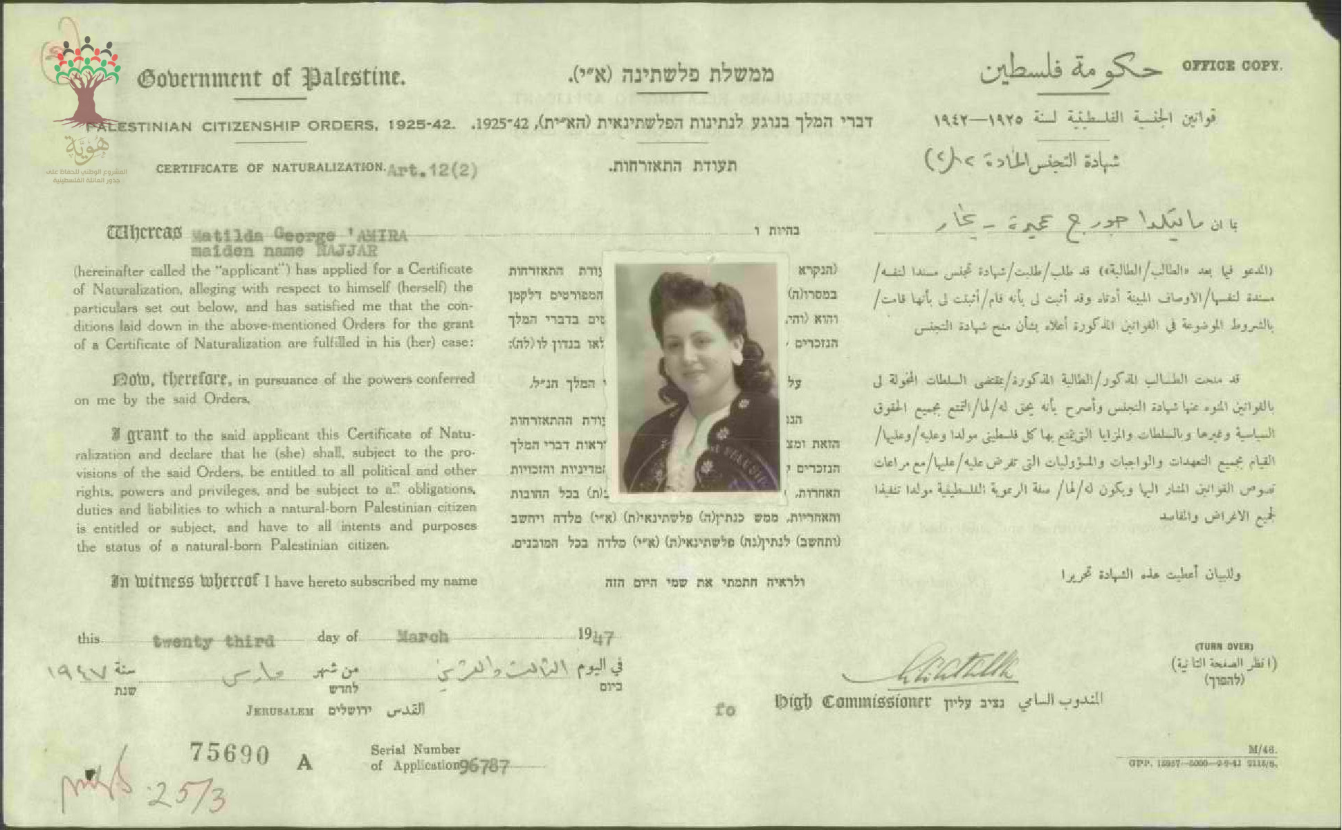 شهادة الجنسية الفلسطينية ل ماتيلدا نجار عميرة