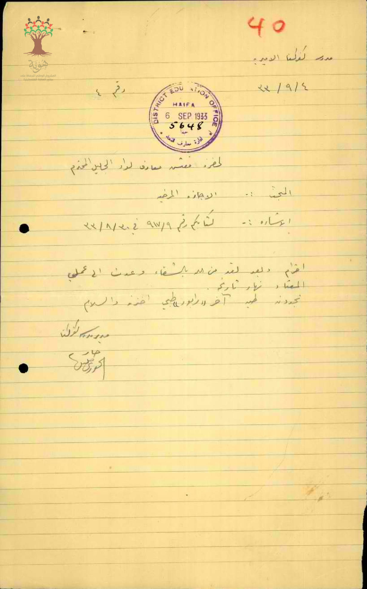 رسالة من المعلم جابر خوري إلى مفتش المعارف يعلمه بعودته إلى المدرسة