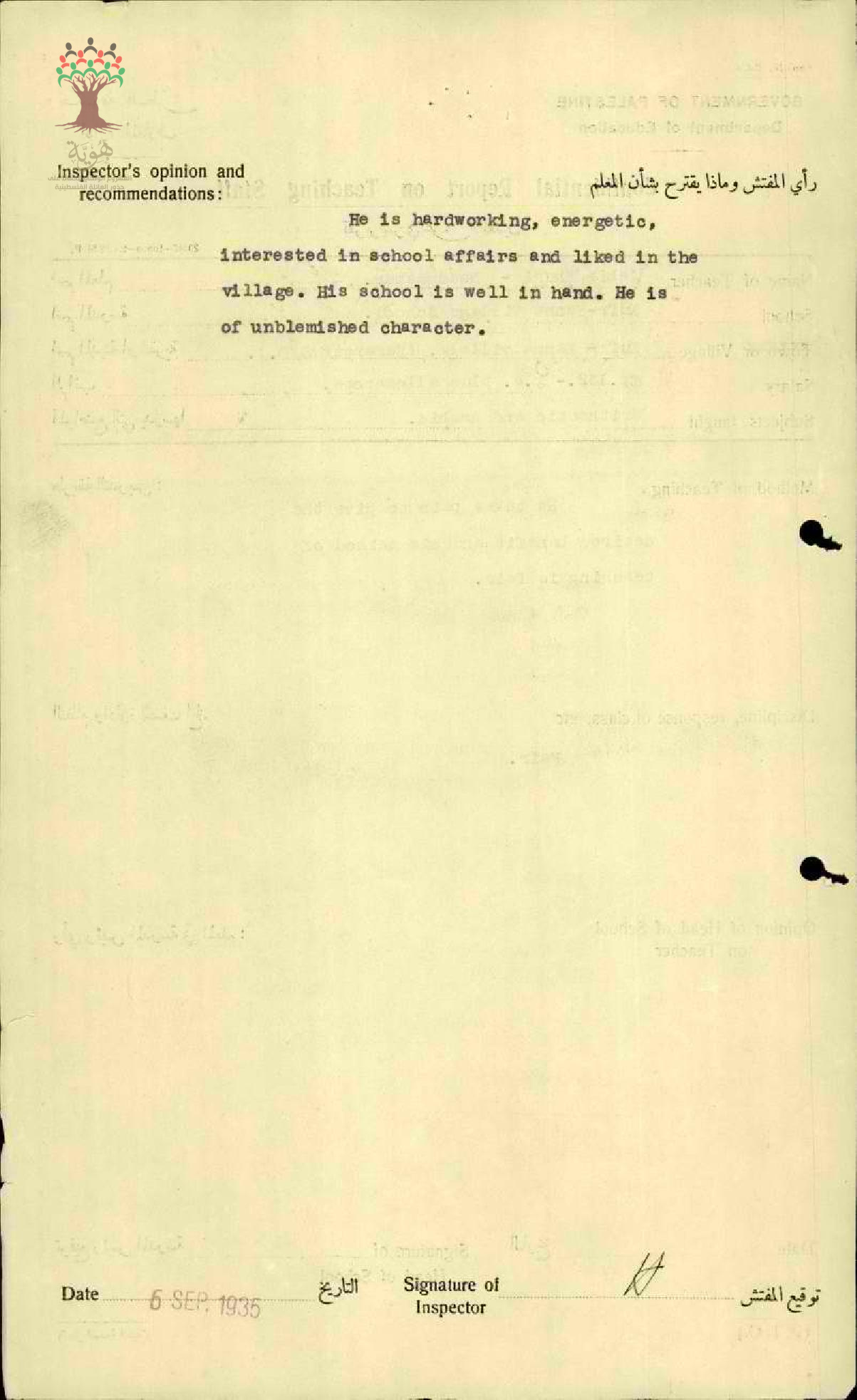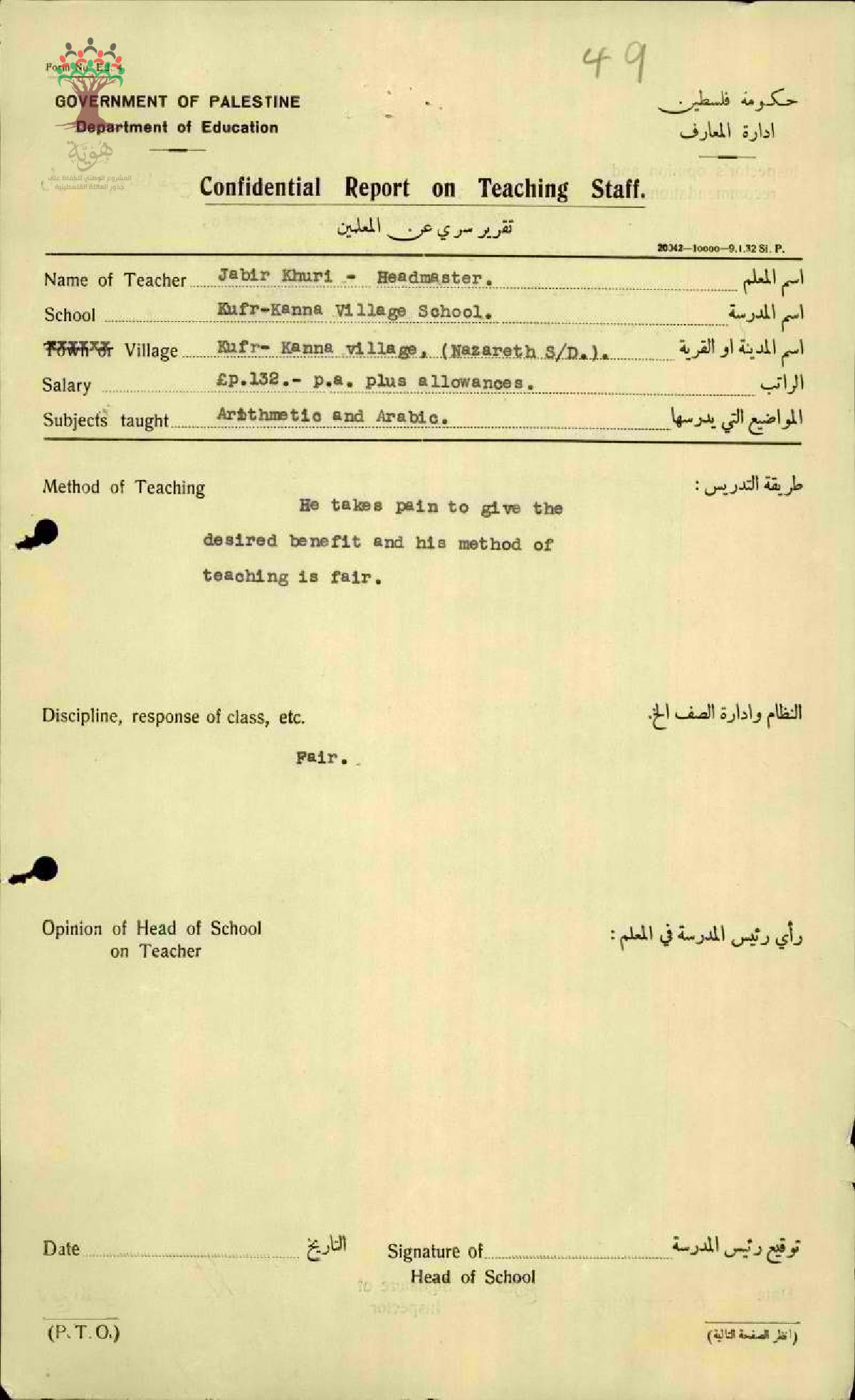 تقرير تفصيلي عن أداء المعلم جابر خوري في مدرسة كفر كنا سنة 1935