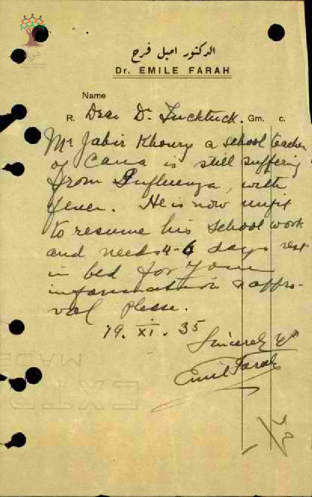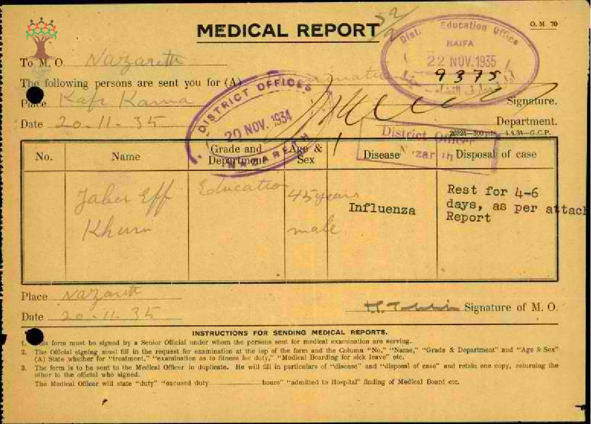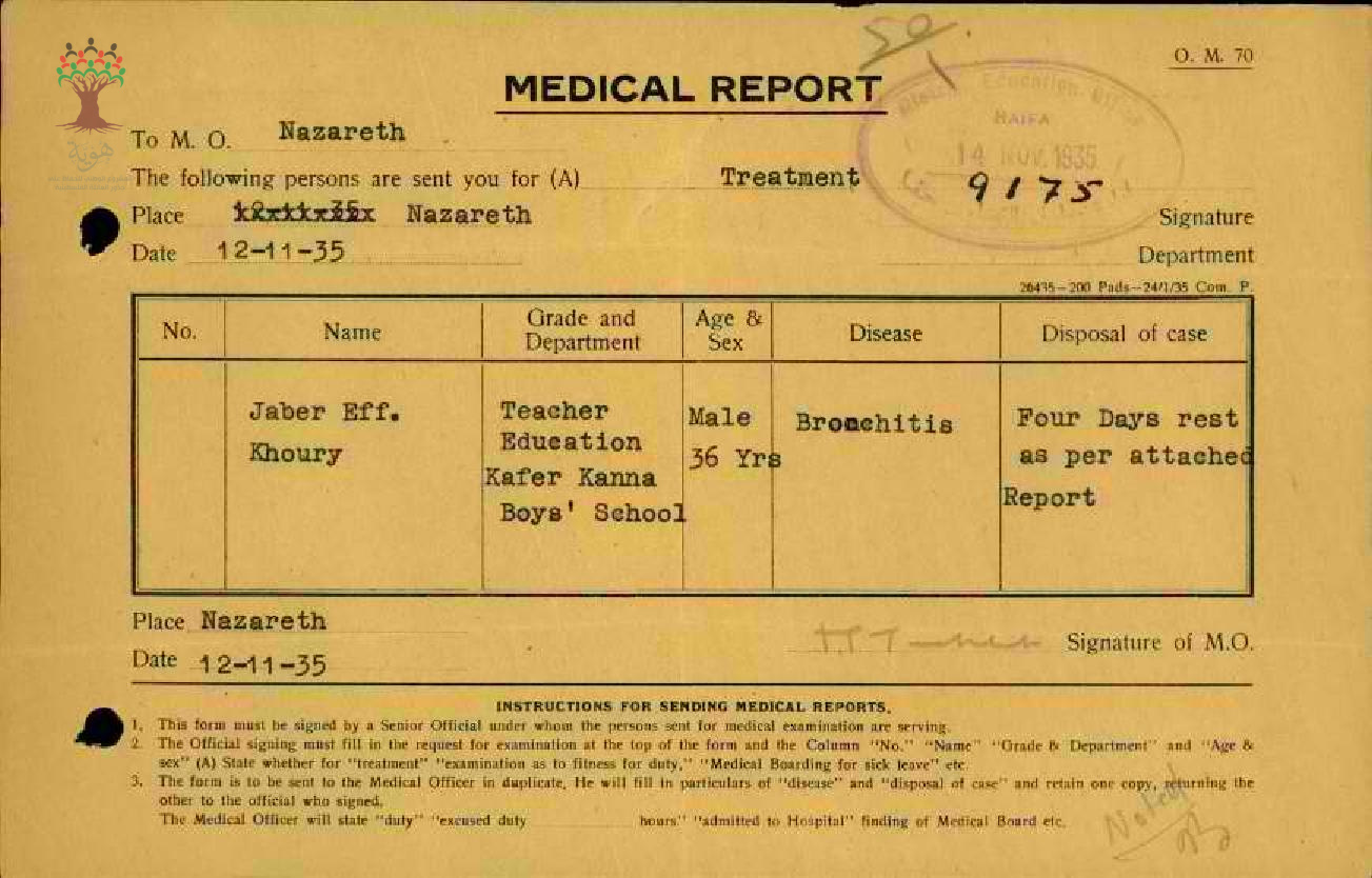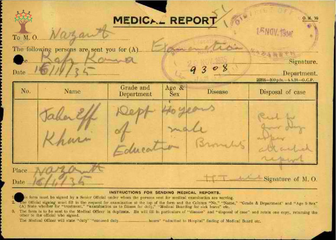 تقارير طبية عن غياب المعلم جابر خوري عن العمل في مدرسة كفر كنا