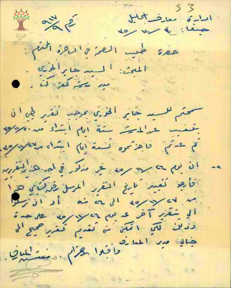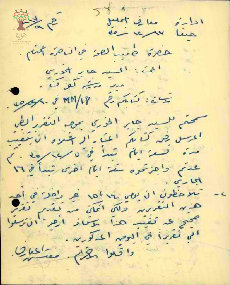 رسالة من مفتش المعارف إلى طبيب الصحة في الناصرة يطلب منه تغيير تاريخ التقرير الطبي المرسل بخصوص المعلم جابر خوري