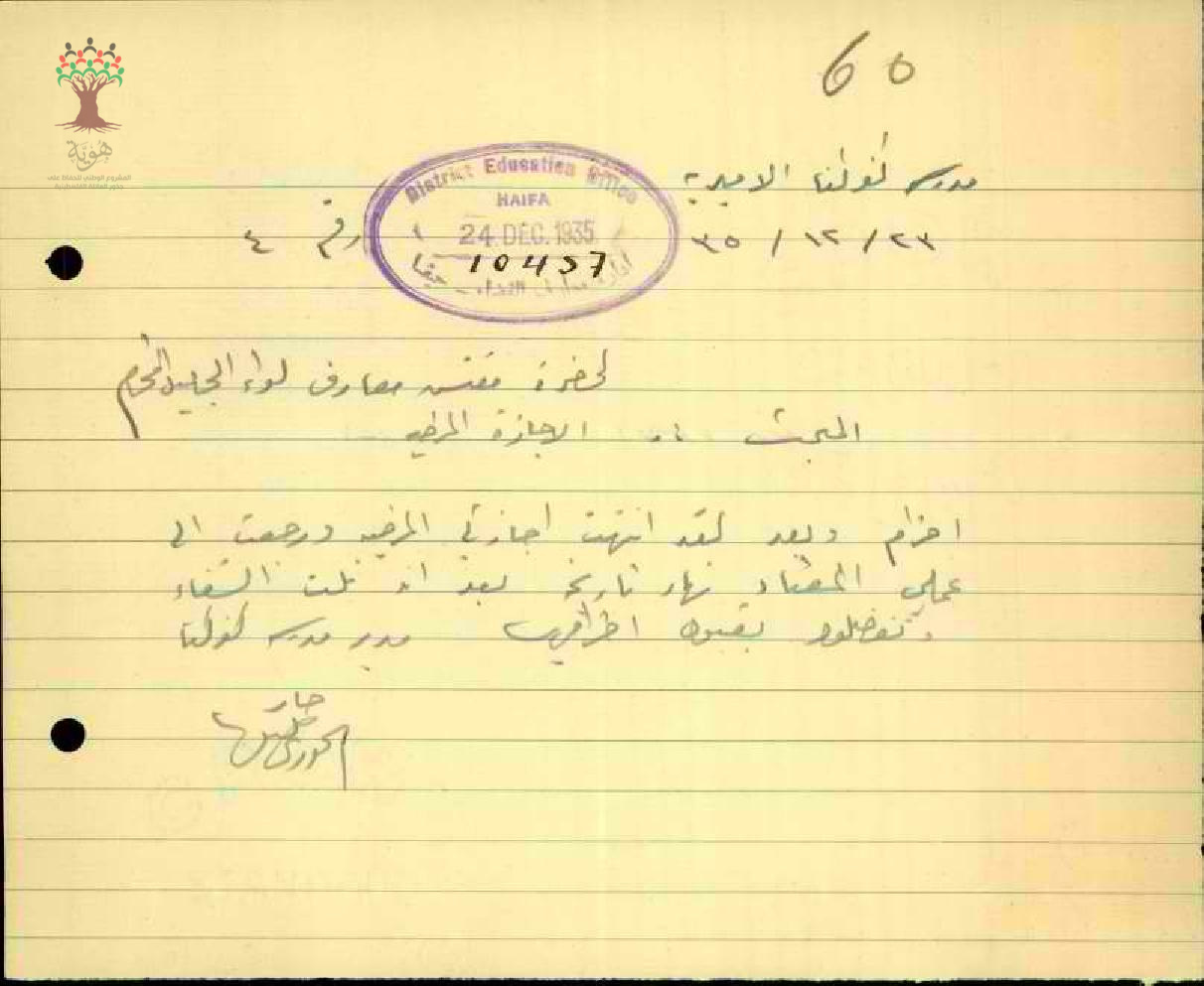 رسالة من المعلم جابر خوري إلى مفتش المعارف يعلمه بعودته بانتهاء اجازته المرضية وعودته إلى العمل في المدرسة