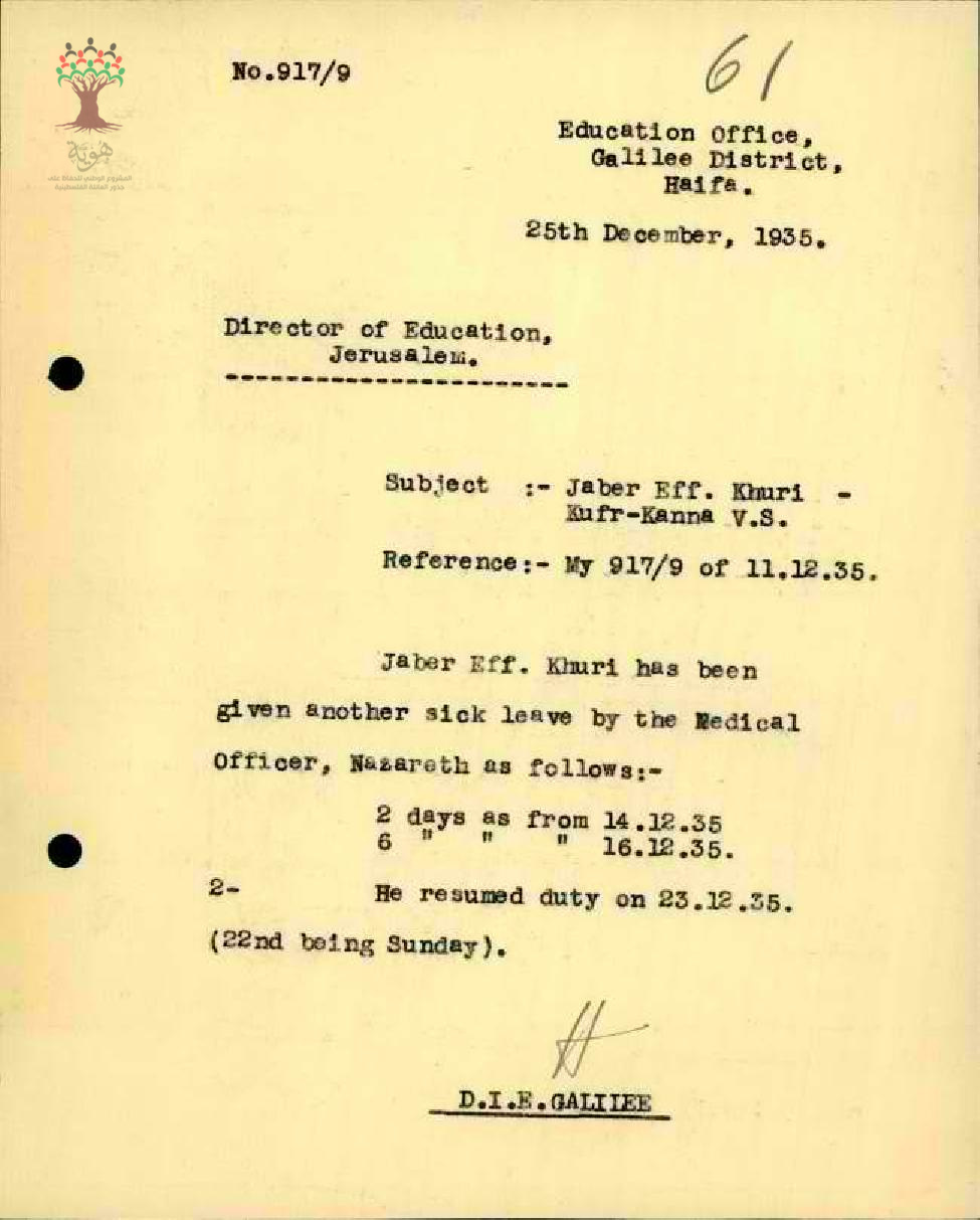 رسالة من مفتش المعارف إلى مدير المعارف يعلمه بغياب وعودة المعلم جابر خوري