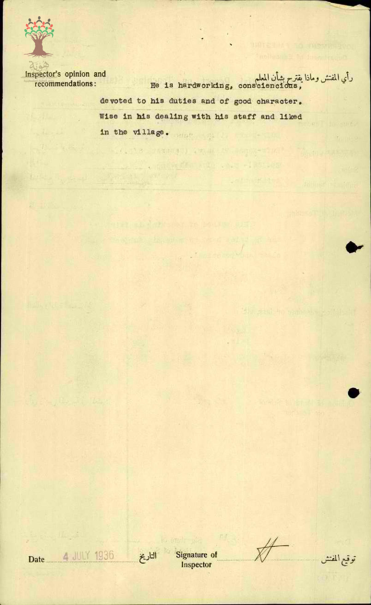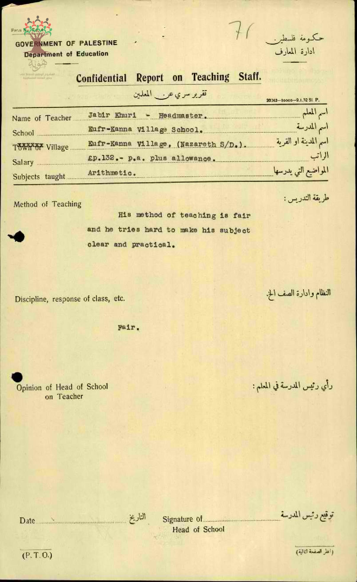 تقرير تفصيلي عن أداء المعلم جابر خوري في مدرسة كفر كنا سنة 1936
