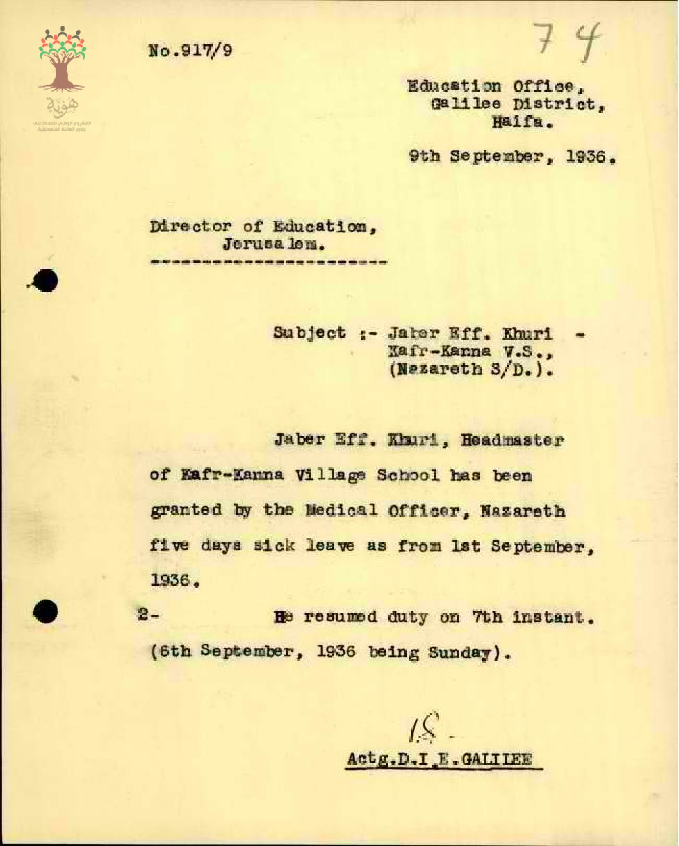 رسالة من مفتش المعارف إلى مدير المعارف يبحث معه اجازة المعلم جابر خوري المرضية وعودته إلى العمل