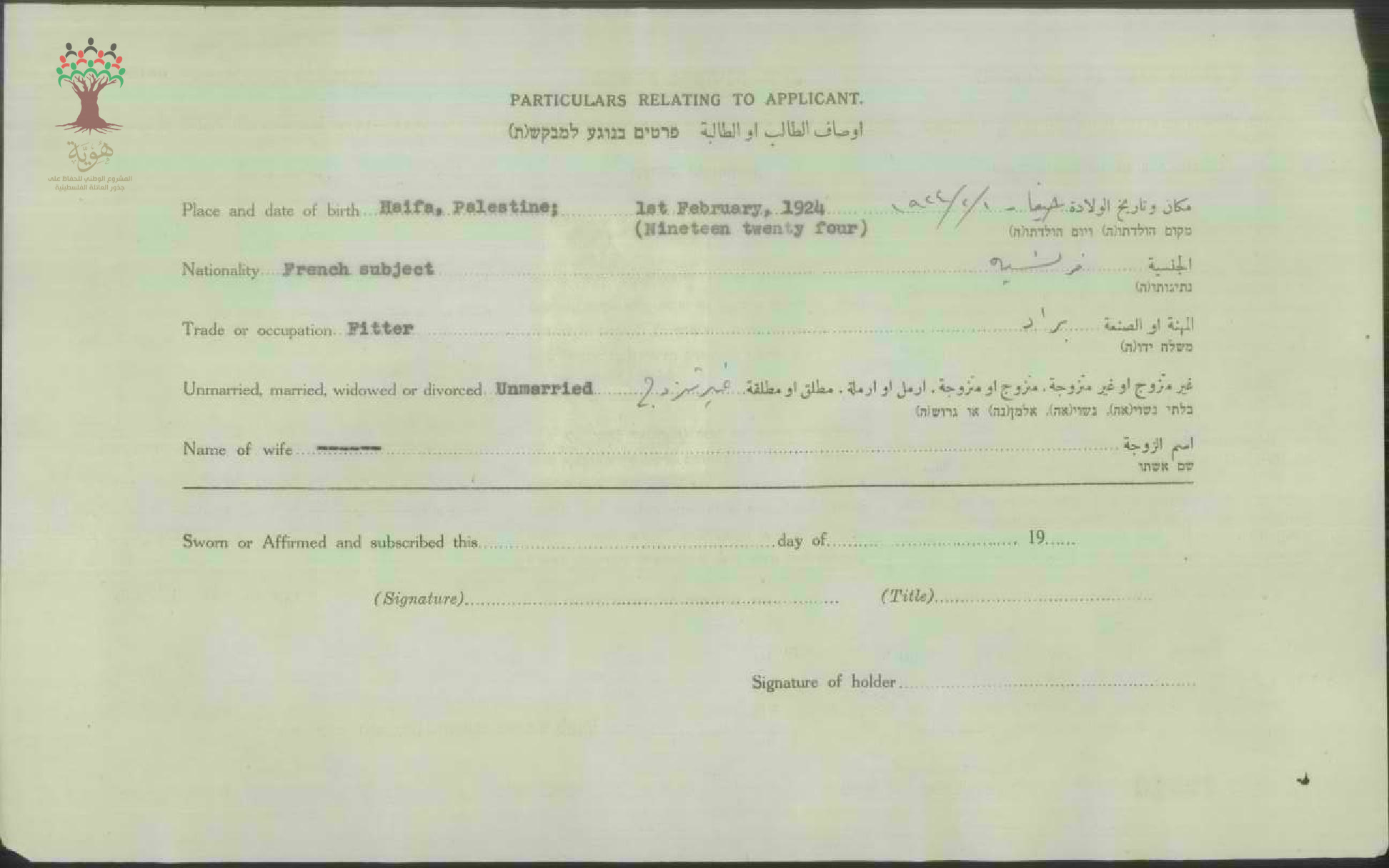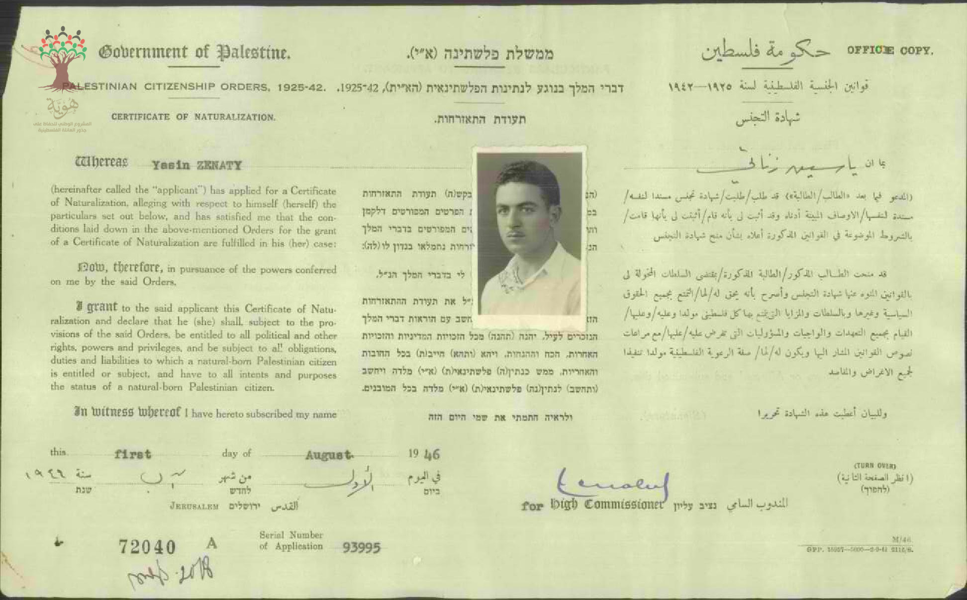 شهادة الجنسية الفلسطينية ل ياسين زيناتي
